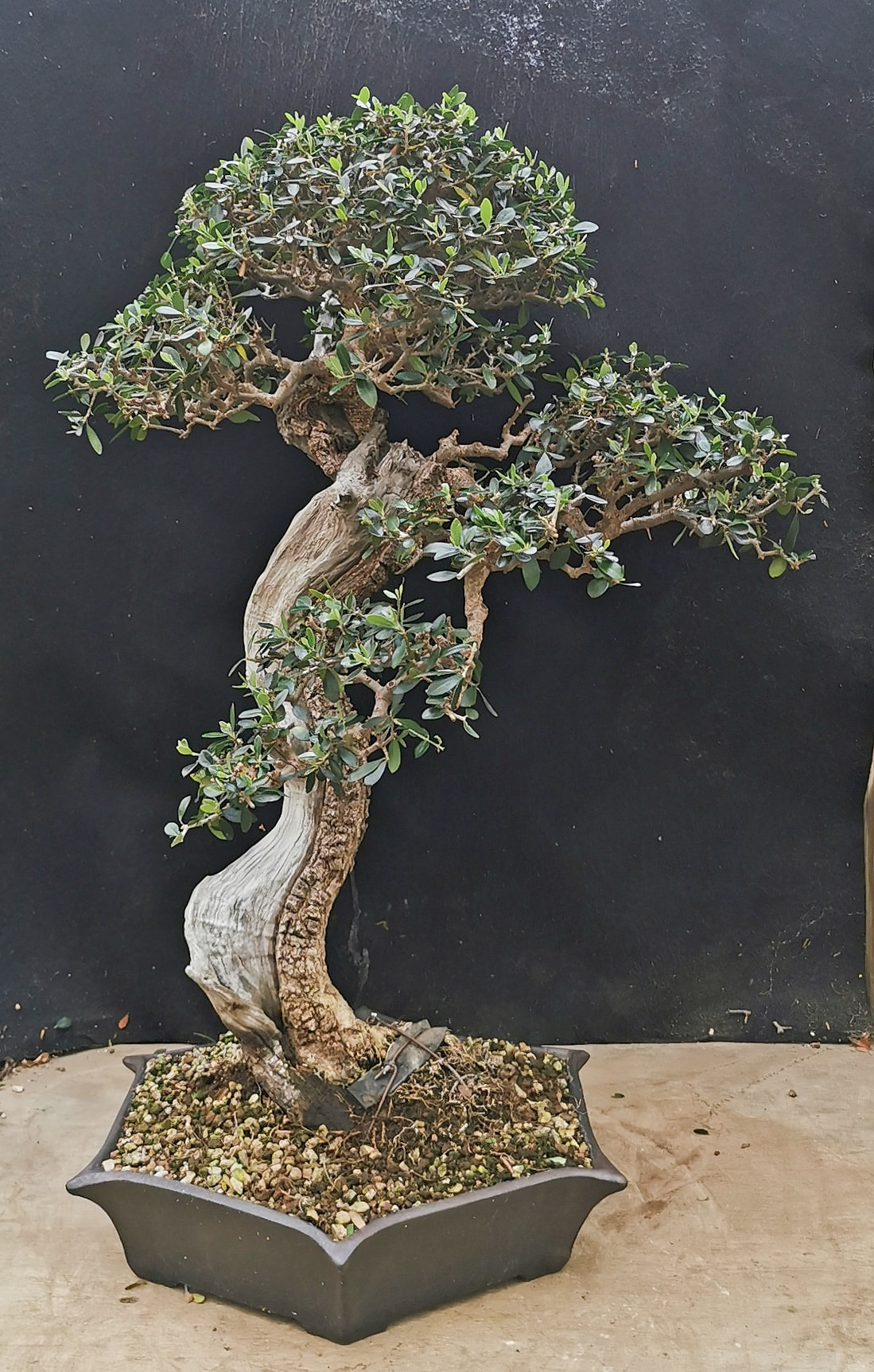 Merci pour vos retours, comme @Clem avec un angle sur la face j’ai l’impression que l’arbre bouge, l’ensemble paraît plus dynamique, mais vu que le nébari va sûrement être le point faible de cet olivier, de mémoire le bois mort se prolonge dans le sol et les racines sont côté « veine » et d’après l’analyse d’Edo l’autre version devrait être la plus adaptée. Si je me retrouve le jour du rempotage le cul entre deux chaises, j’aurai l’air malin . Avec le bois mort qui se prolonge dans le substrat je pense être obligé de « motter » un peu l’arbre dans le pot. Je serai peut-être obligé de faire un peu de Dendro-chirurgie pour que ça passe, et avoir un pot de secours si jamais je me retrouve dans une impasse.