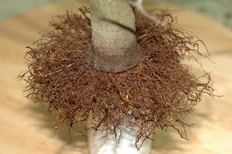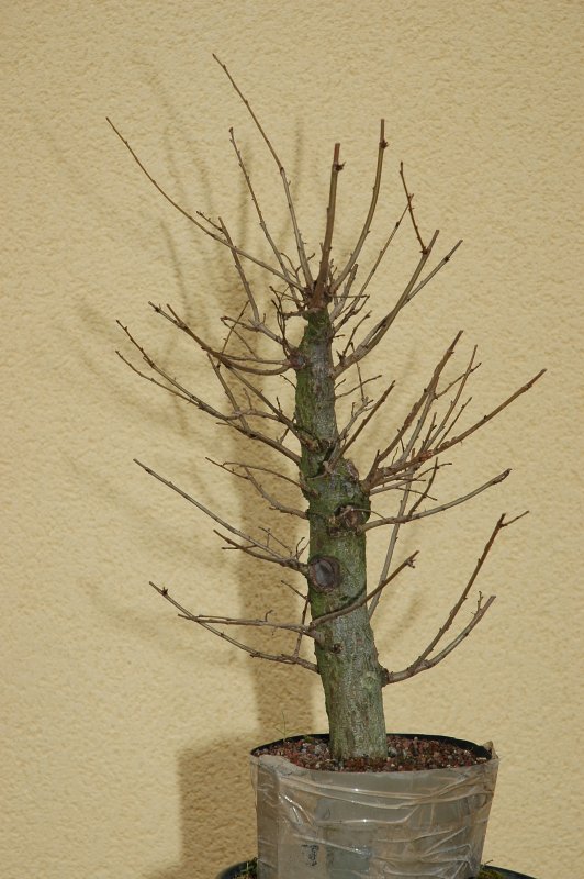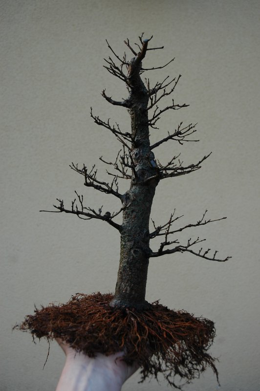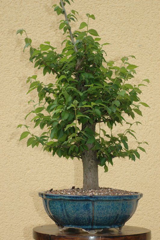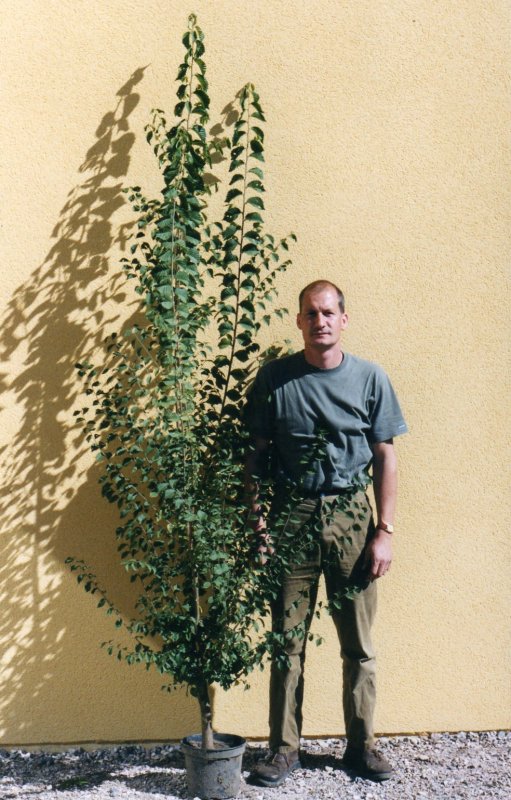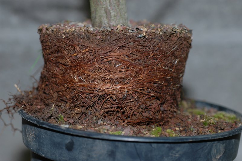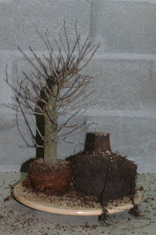 Un tout jeune petit plant d’orme champêtre mis en culture en pleine terre (dans son container) pendant une dizaine d’années, et ressorti en 2002 (j’ai du couper toutes les racines qui étaient sorties par les trous de drainage):