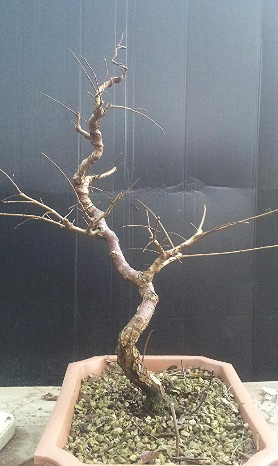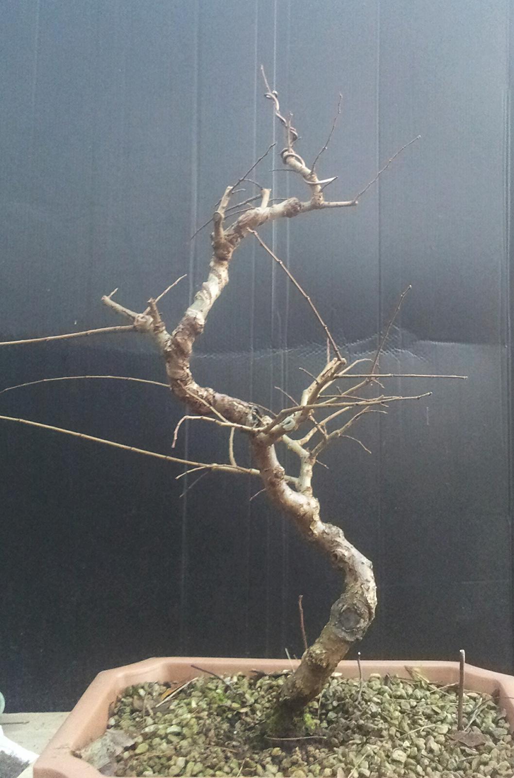 Un petit travail avec une bouture réalisée en mars 2014, rempotage de la bouture en pot de 1,5L en juillet avec premier travail du nébari(sélection d’un seul étage de racines) puis pousse libre le restant de la saison.