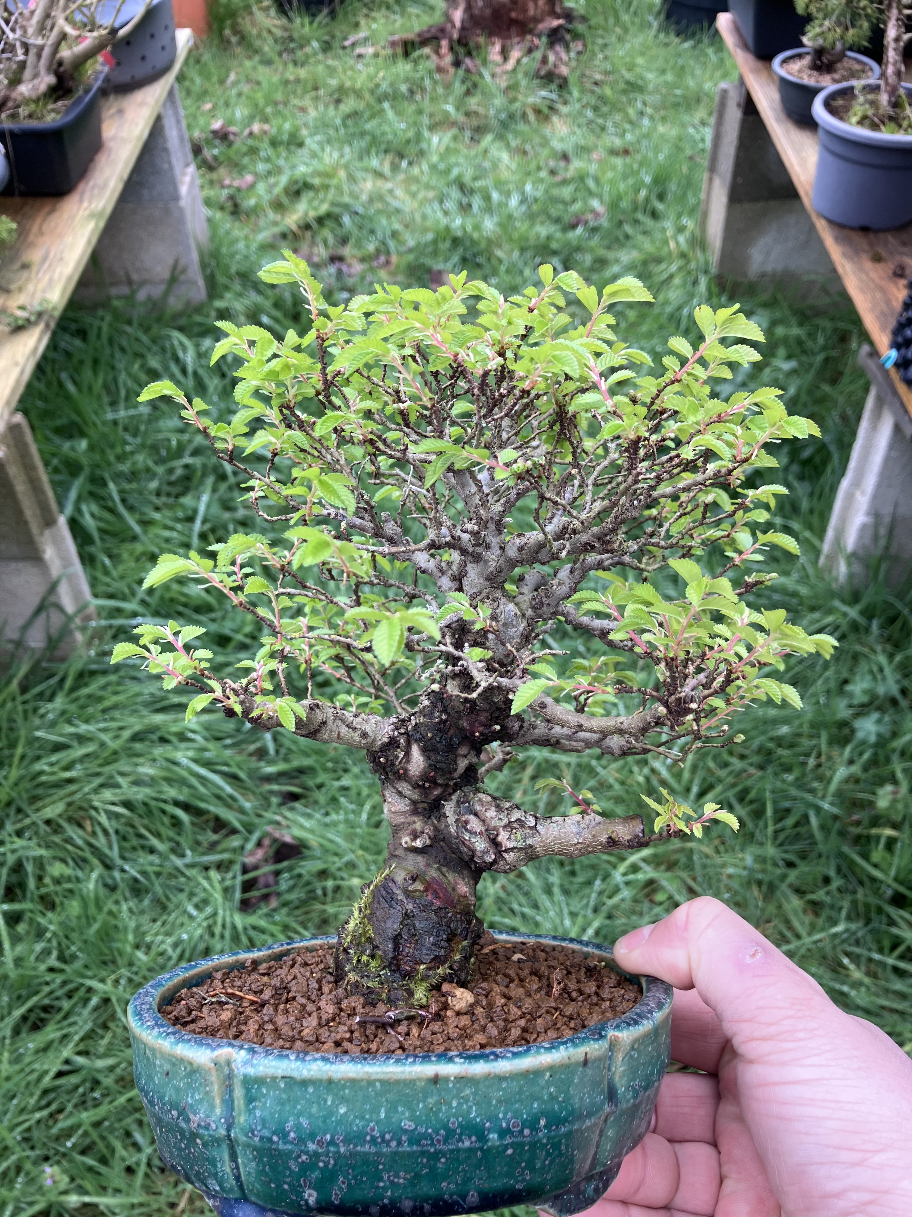 Donc, un petit orme du Japon 'nire" (à écorce liégeuse), acquis l'hiver 2020, et rempoté cette année-là avec une taille importante des racines (ma philosophie pour les nouveaux arrivants : on coupe tout, et on repart sur des bases saines - certains verront la référence).