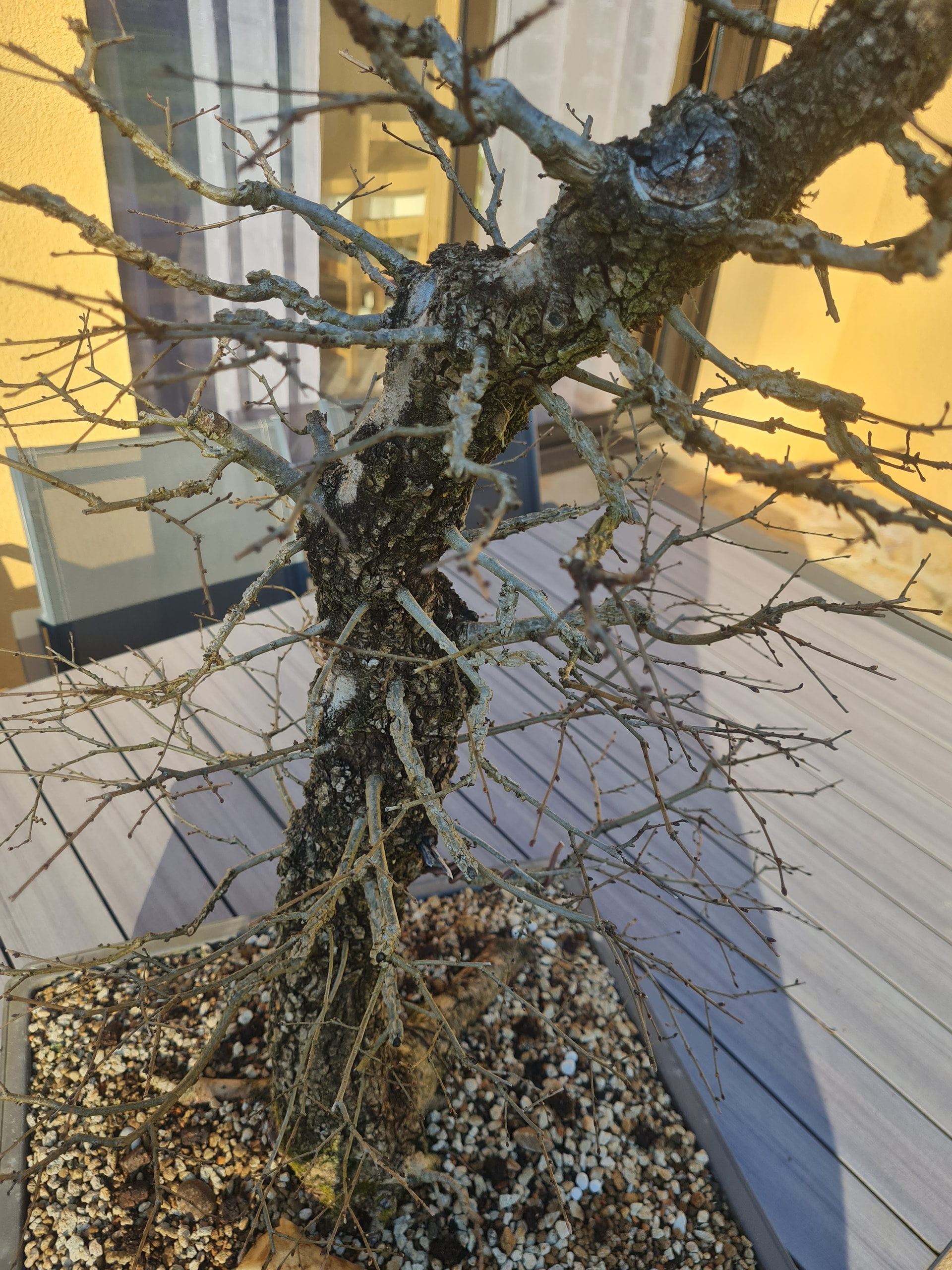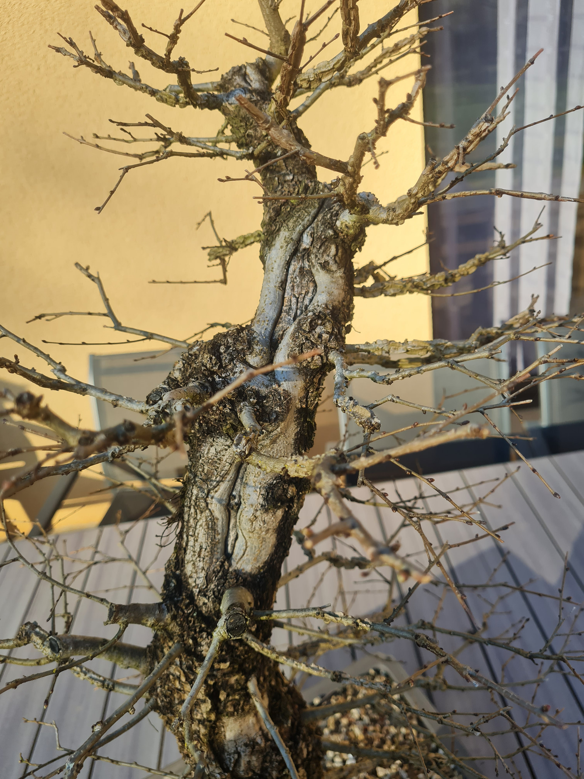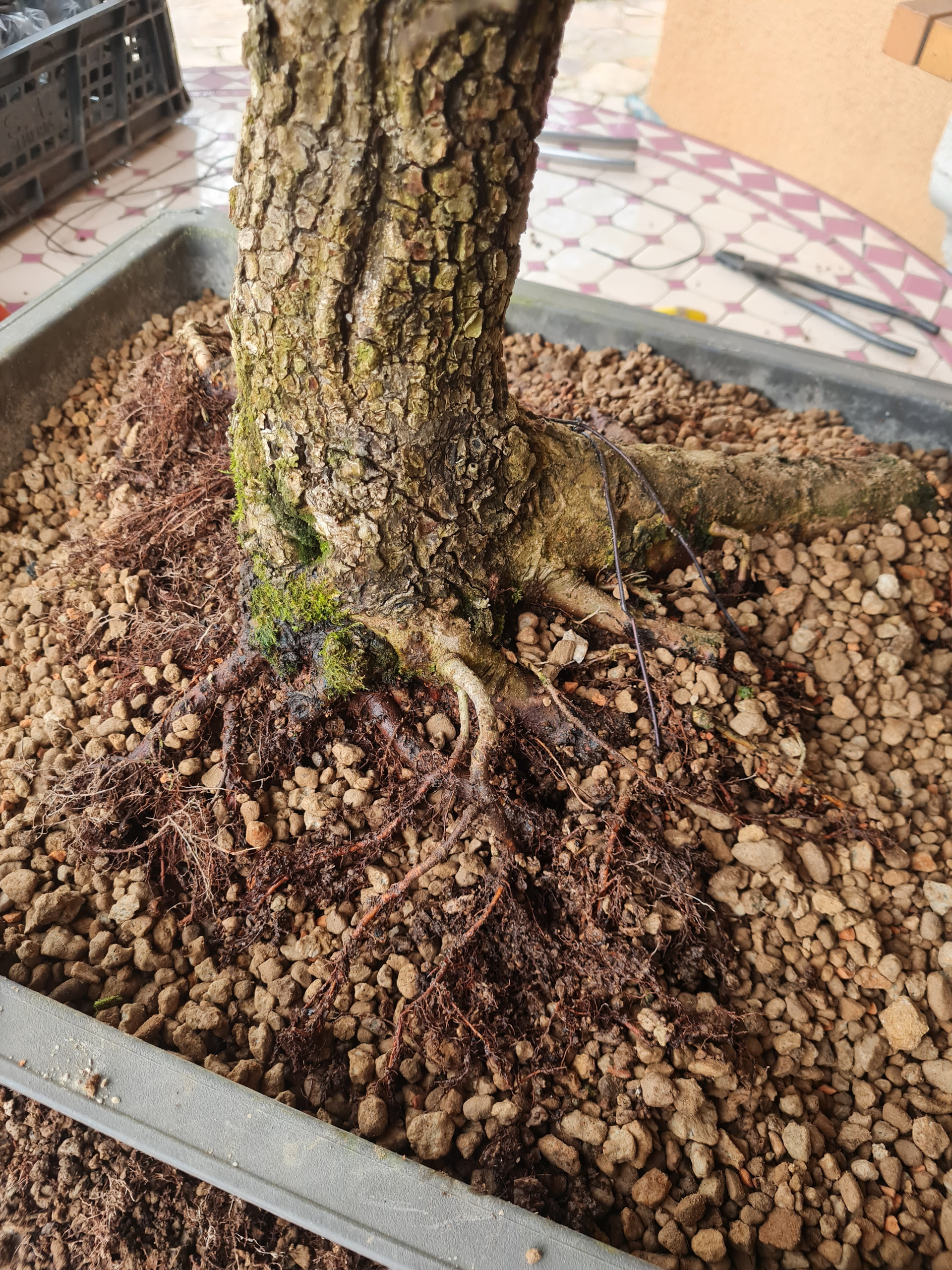 On voit que le nebari s’améliore un peu avec le temps, cette année j’ai essayé de bien démêler tout ça, c’est pas parfait mais il y a de la racine sur tout le tour.