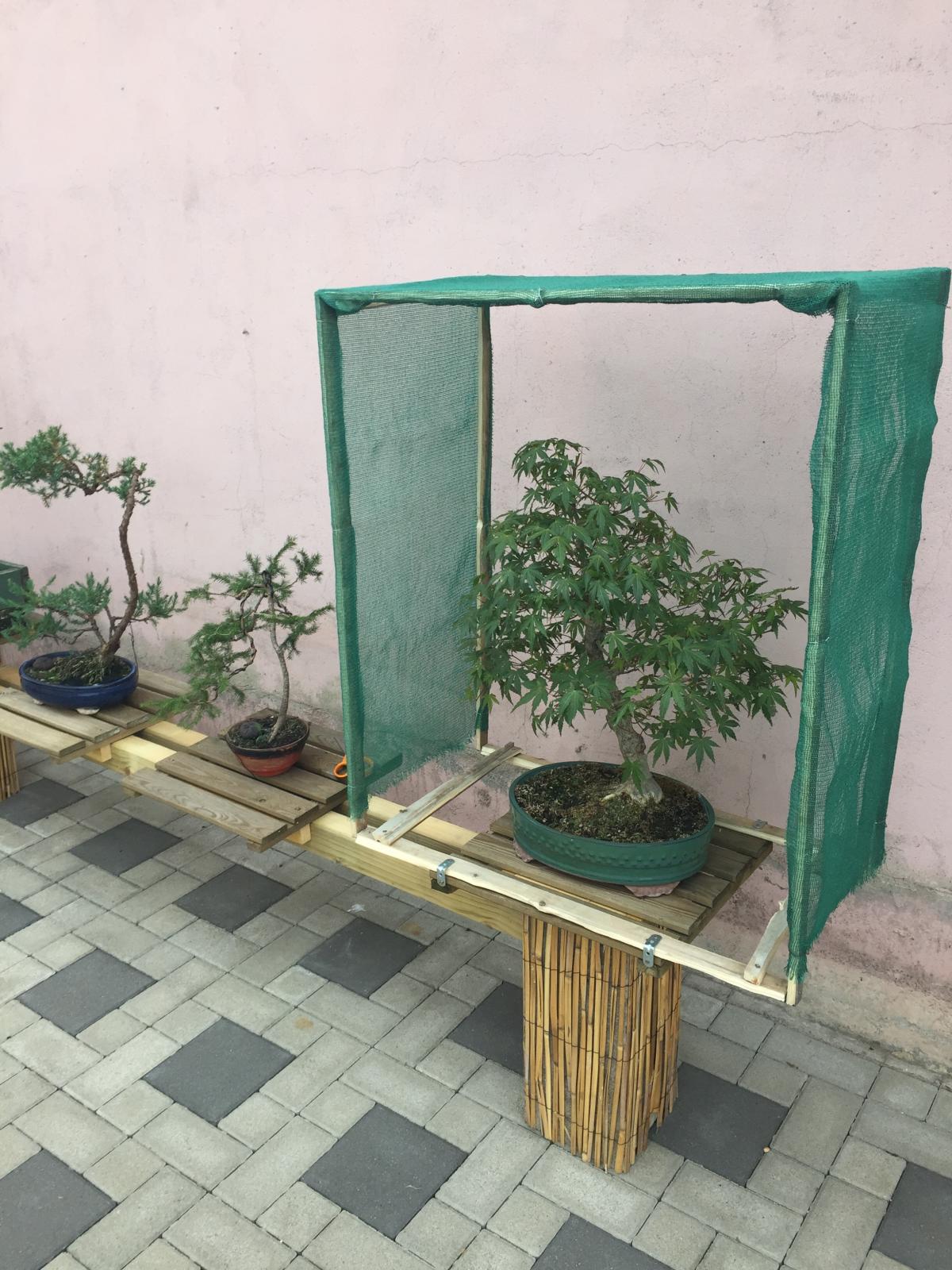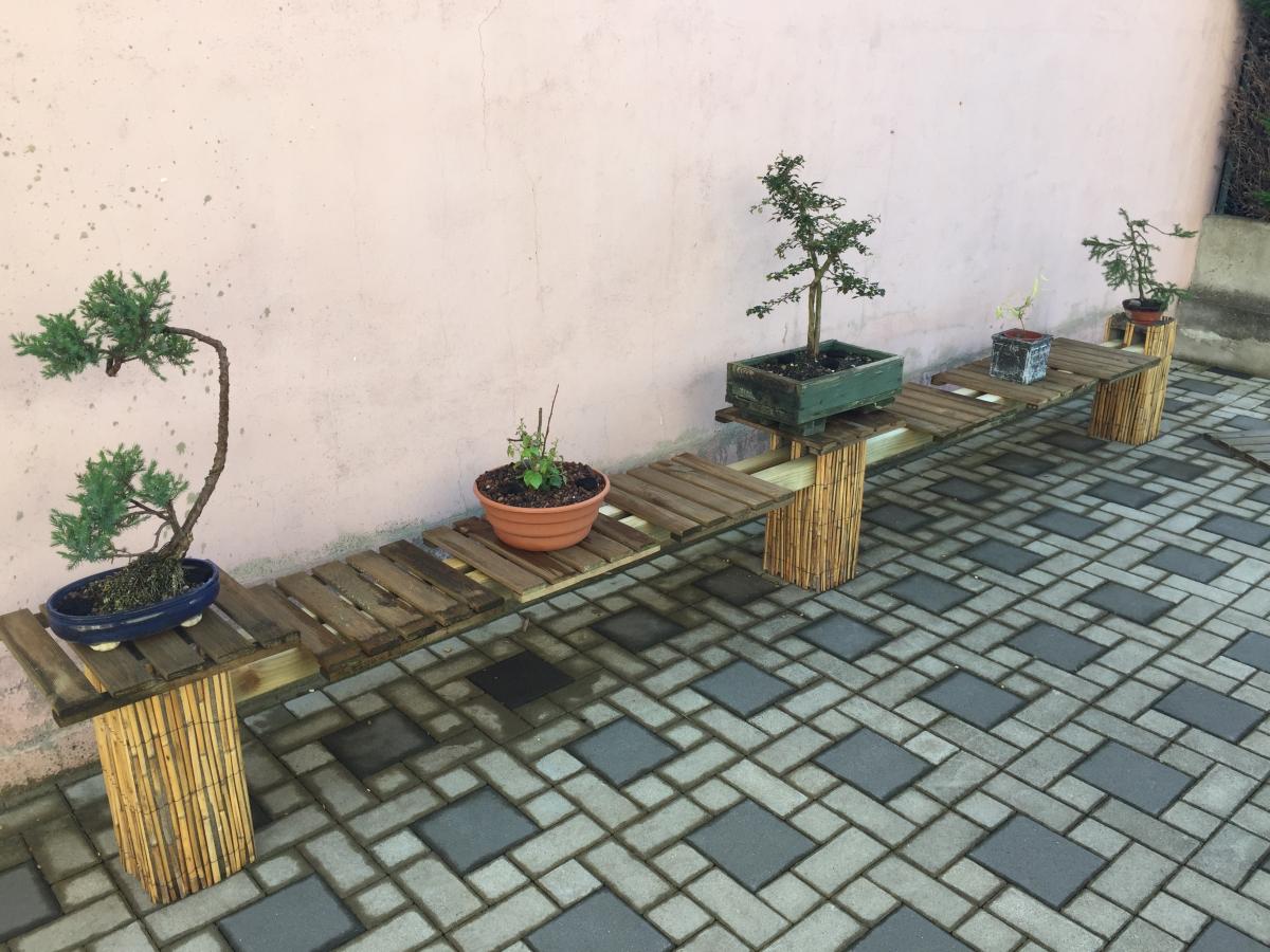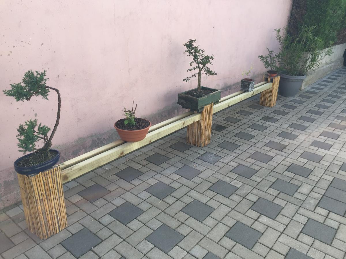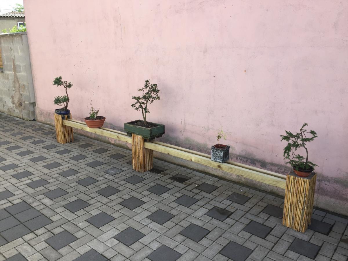 Sympa pour commencé, même si l ensemble est stable,un pot finira par tomber comme c’est là, tes étagères ne doivent pas être moins larges que tes pots, tu devrais tous simplement rajouter des planches plus larges entre tes 3 agglos et aussi dessus pour une meilleure assise de tes arbres, et cela restera esthétiquement bien.