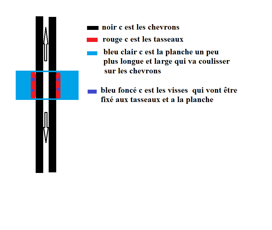 salut , et ben effectivement tu es en plein dedans , bien vu pour le dessin , je rajouterais peu etre un tasseau pour le miieu (entre les 2 chevrons) mais pas sur je verrais ca en temps reel ,