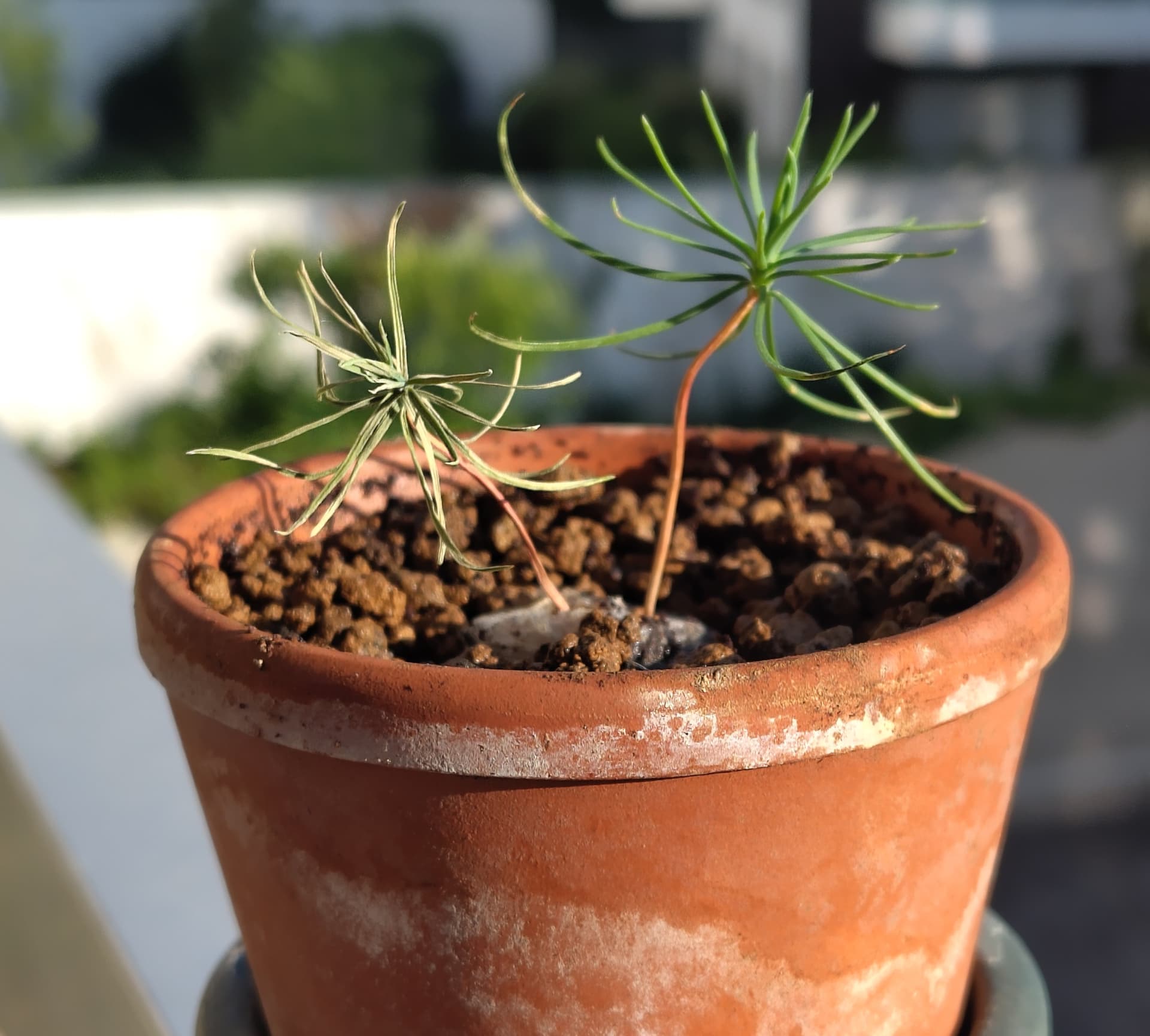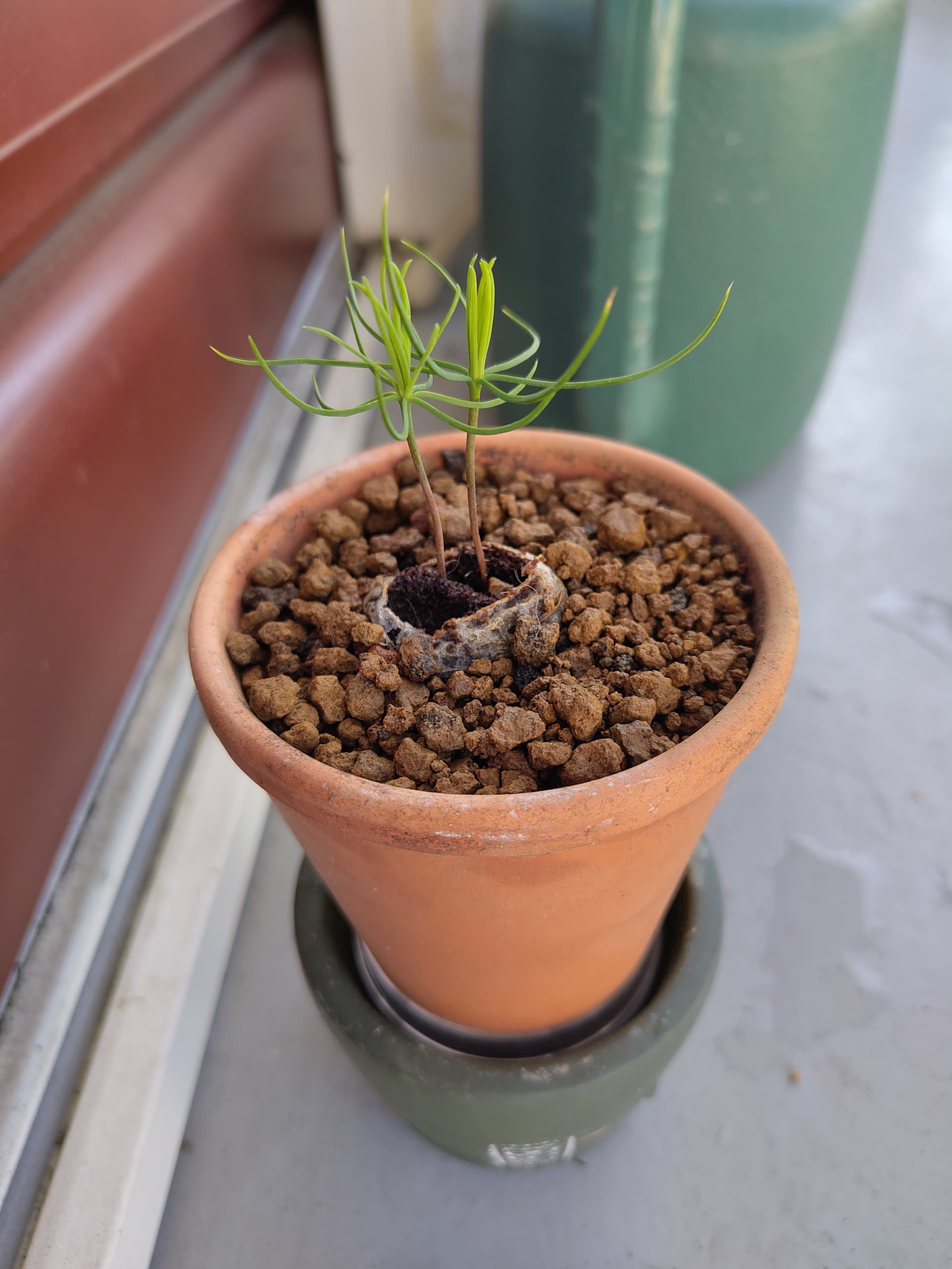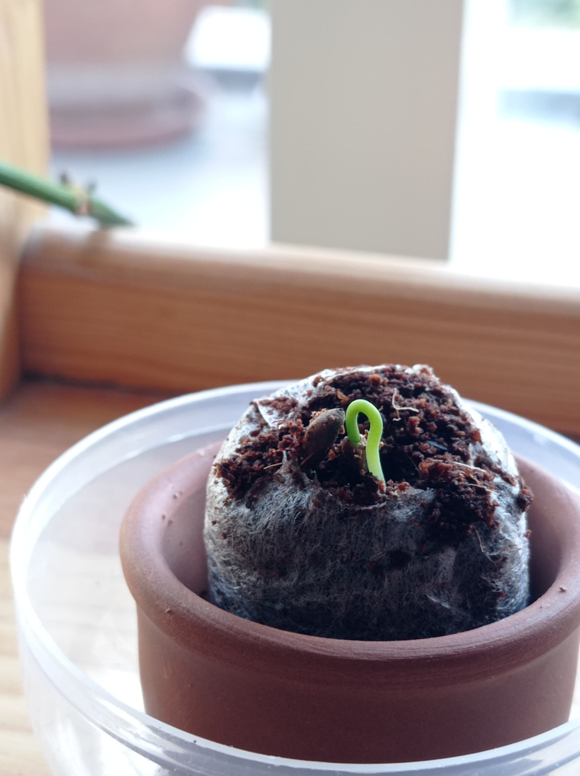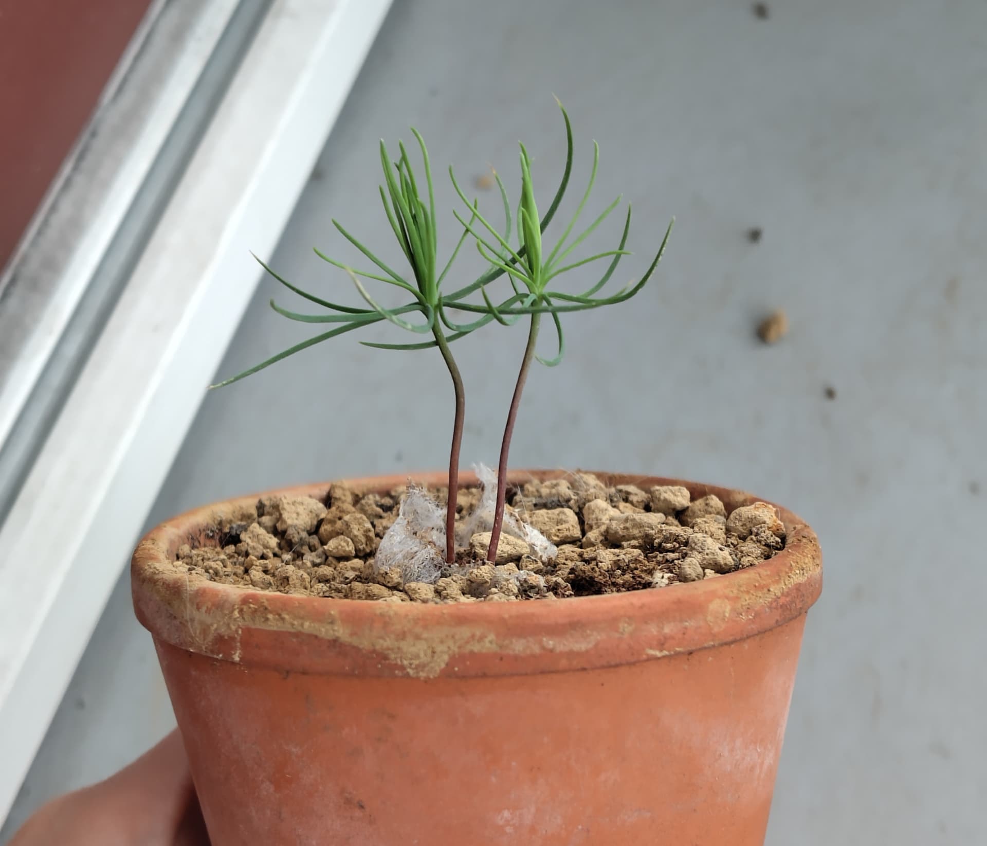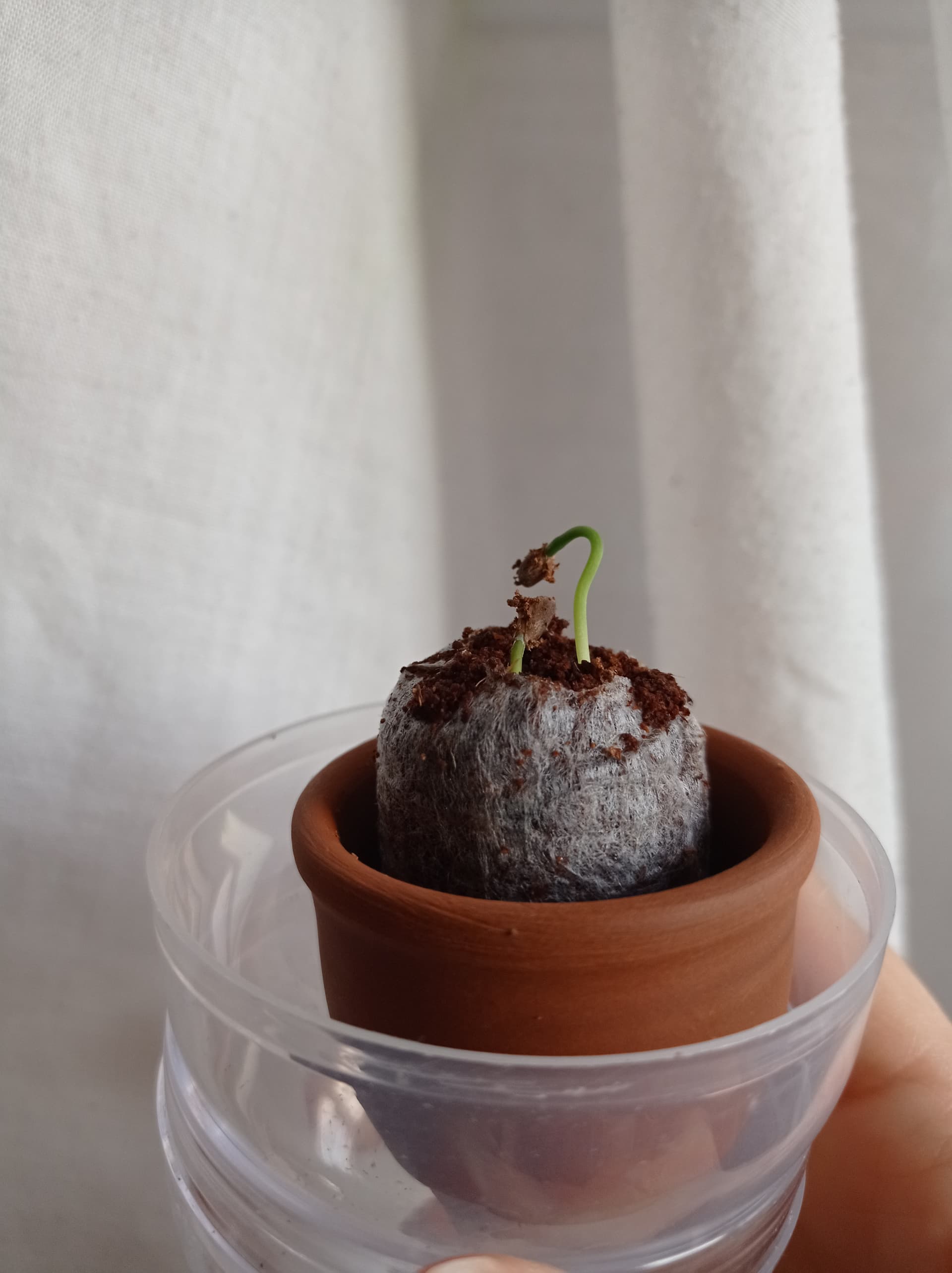 Je les ai semées début avril, et ça a vite pris, j’ai eu 2 germes qui se sont développés jusqu’à mi-mai dans le mini pot, après quoi je les ai transvasés dans un pot plus gros avec de l’akadama sur du gravier pour pas que les racines baignent dans l’eau si elle devaient pousser loin, tout en gardant le filet de terre originel autour de leurs racines pour pas qu’elles se délitent.