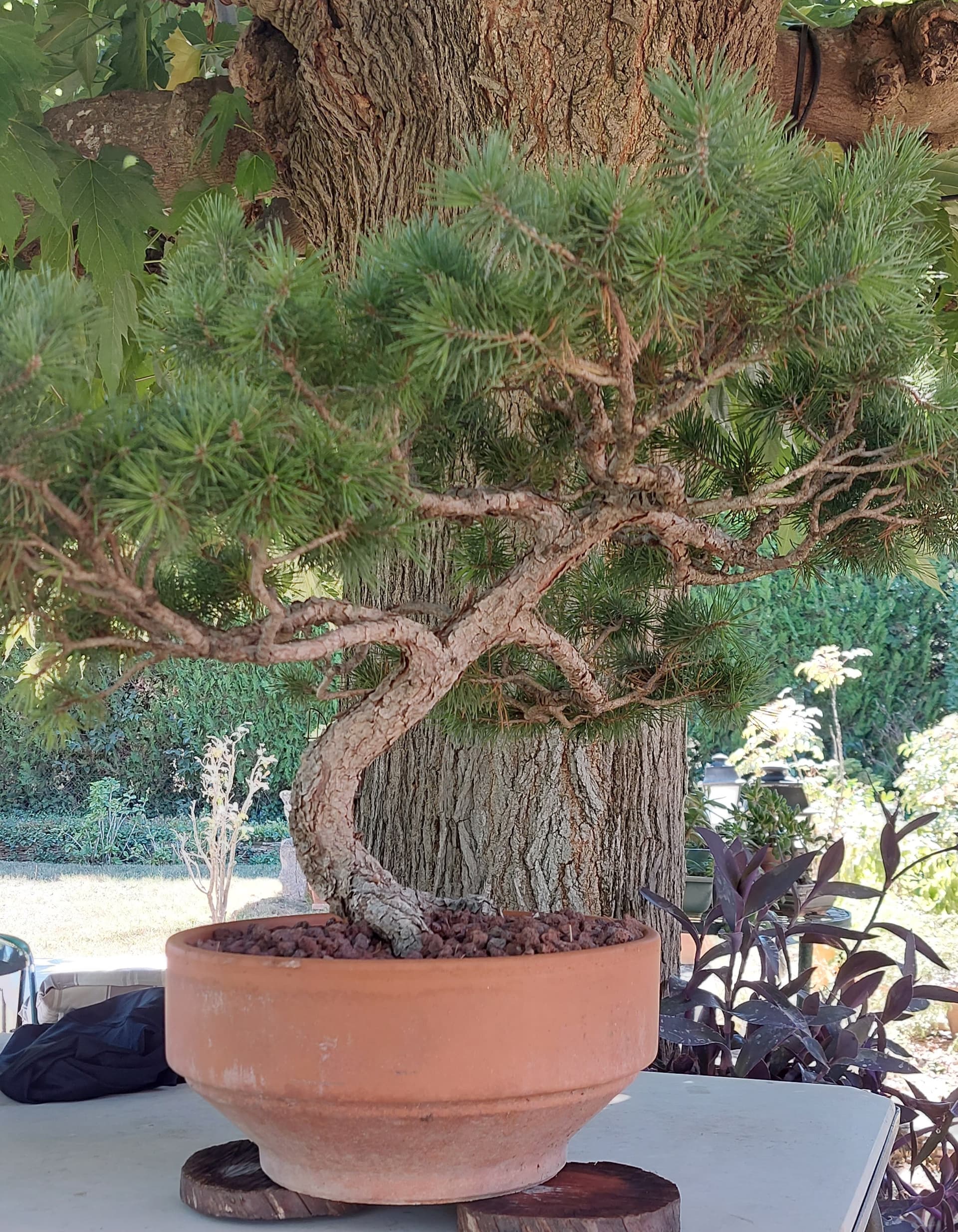 Bonjour, l’histoire d’un pin donné en 2003, un tout petit arbre à l’époque, comme je n’ai pas pu le suivre entre 2005 et 2023 il a simplement poussé, arrosé par de la famille avec seulement une ligature en 2011.