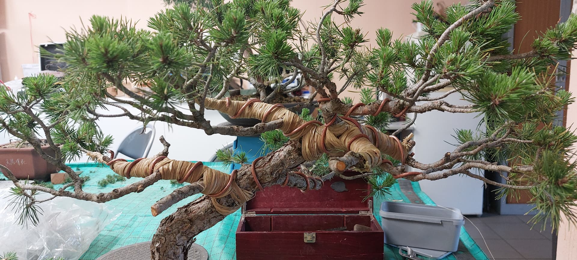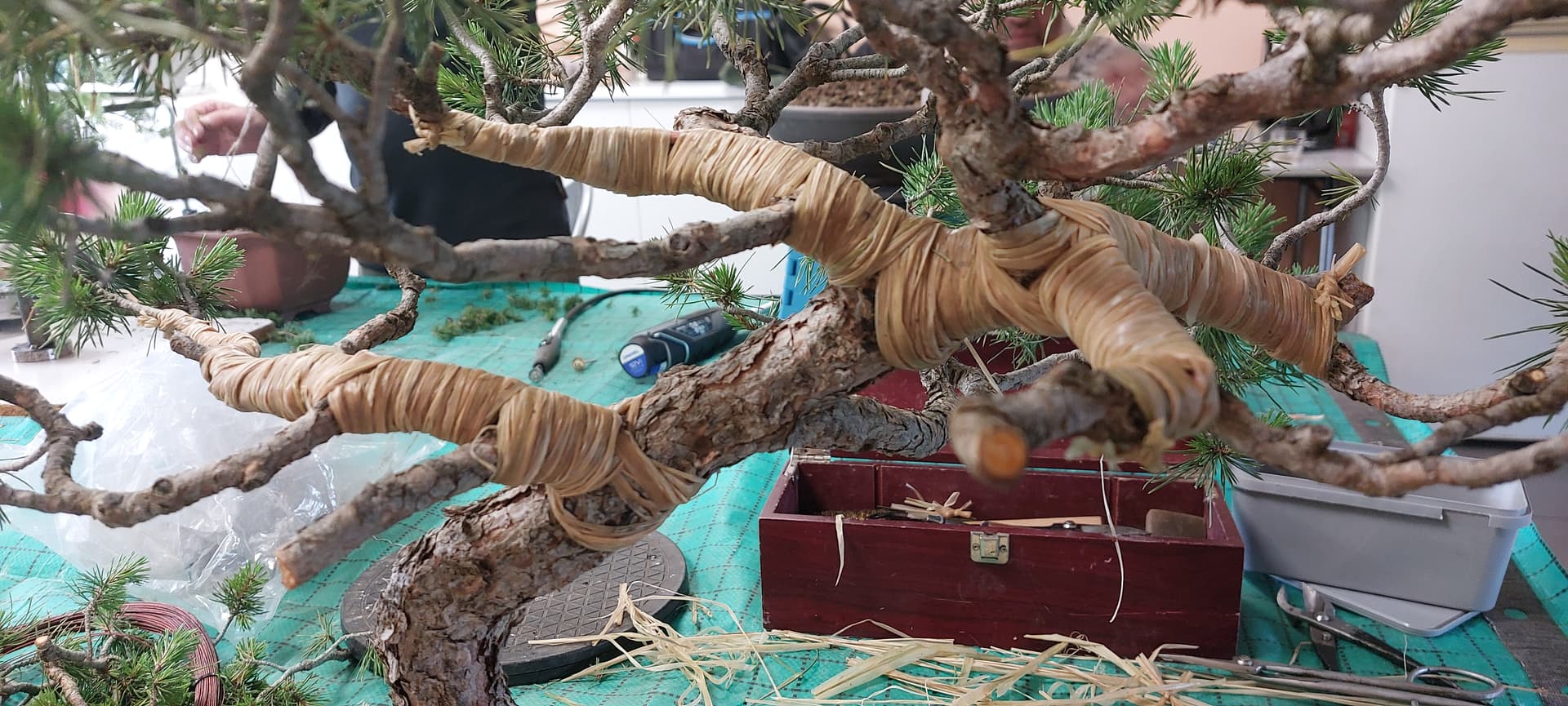 Je me suis rendu compte que j’aimais bien poser le rafia, cela amène à un état de calme et de concentration pour l’arbre. @LeeOw, pour cet atelier nous avions Philippe Sikora. Philippe a confirmé avec moi le projet et fait des remarques très pertinentes.