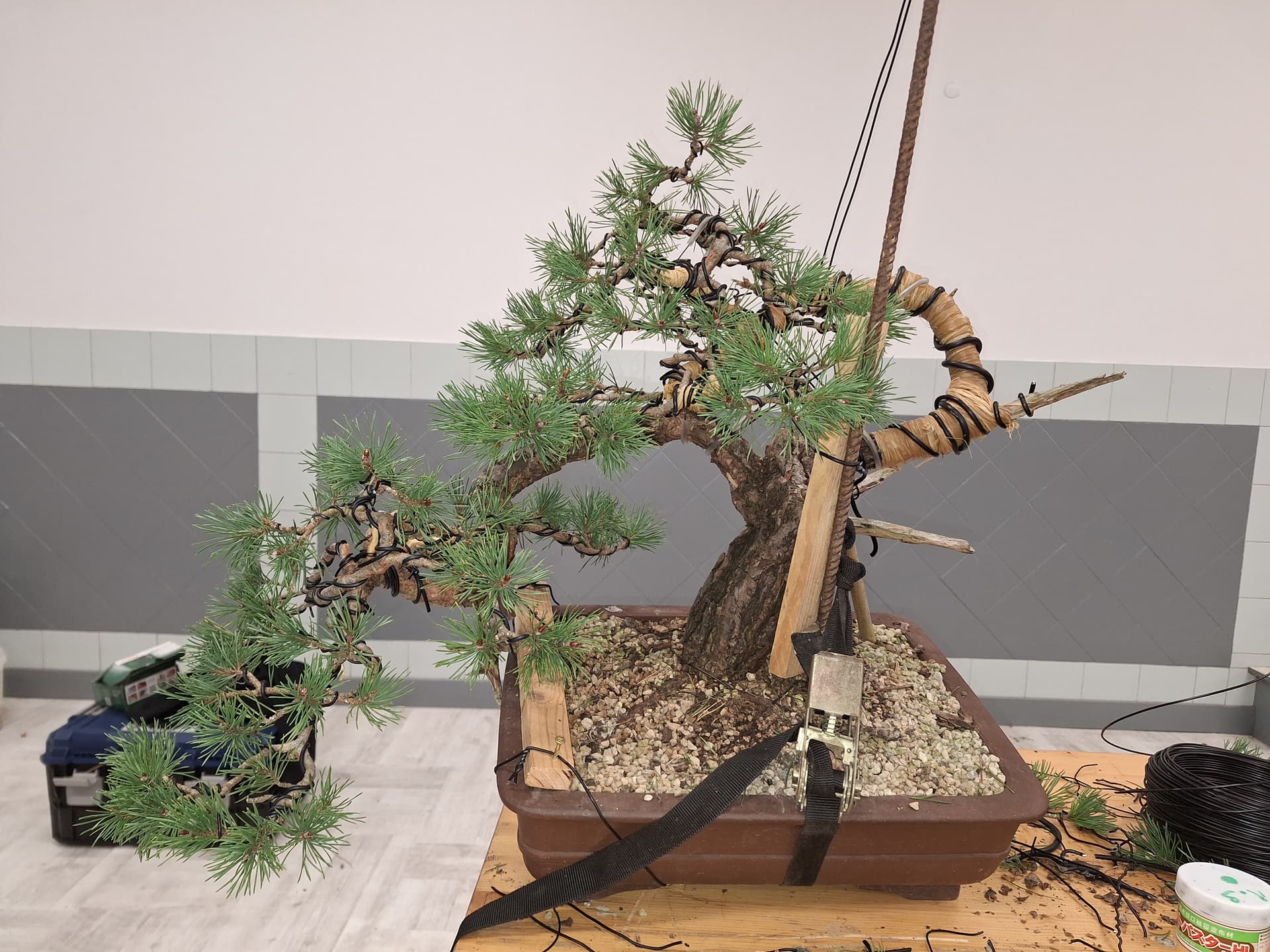 Oui c’est un atelier avec Olivier. Ça fait un moment qu’on discute du devenir de ce pin, et l’idée générale est venue 3 jours avant l’atelier au moment de la pose du raphia. Je me suis rendu compte qu’on pouvait tenter de baisser la branche verticale sans trop de soucis.