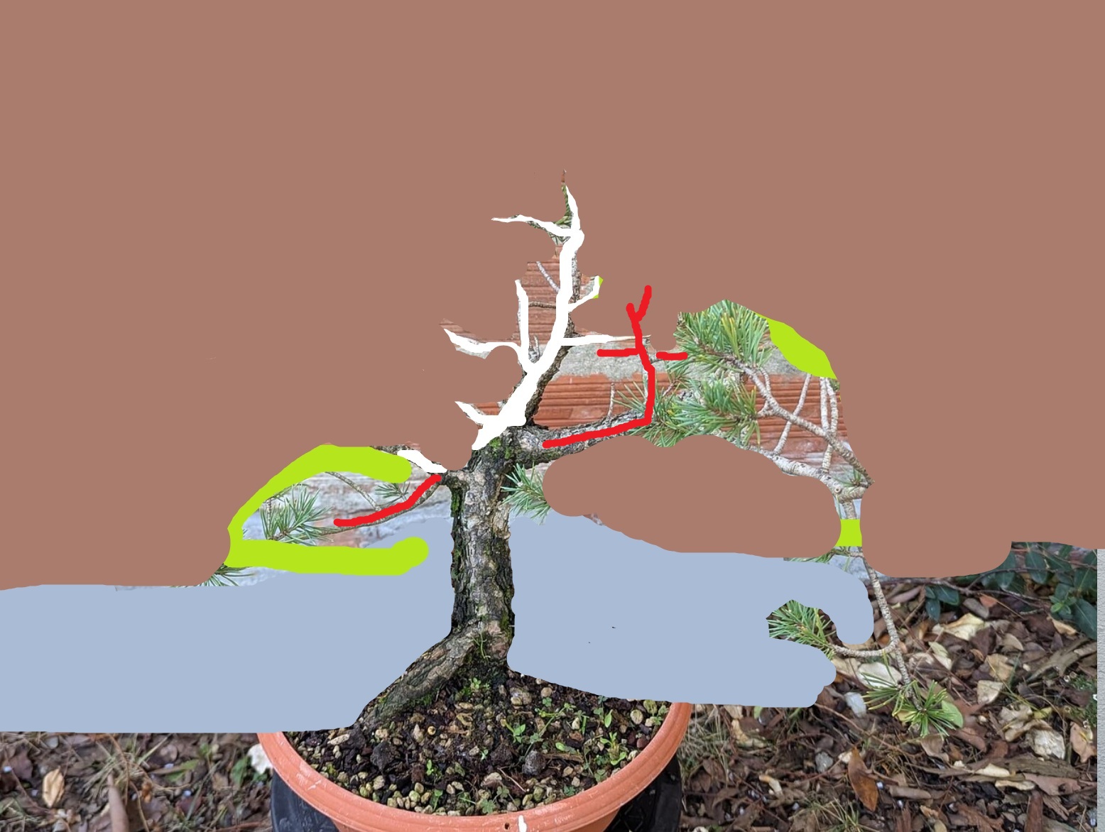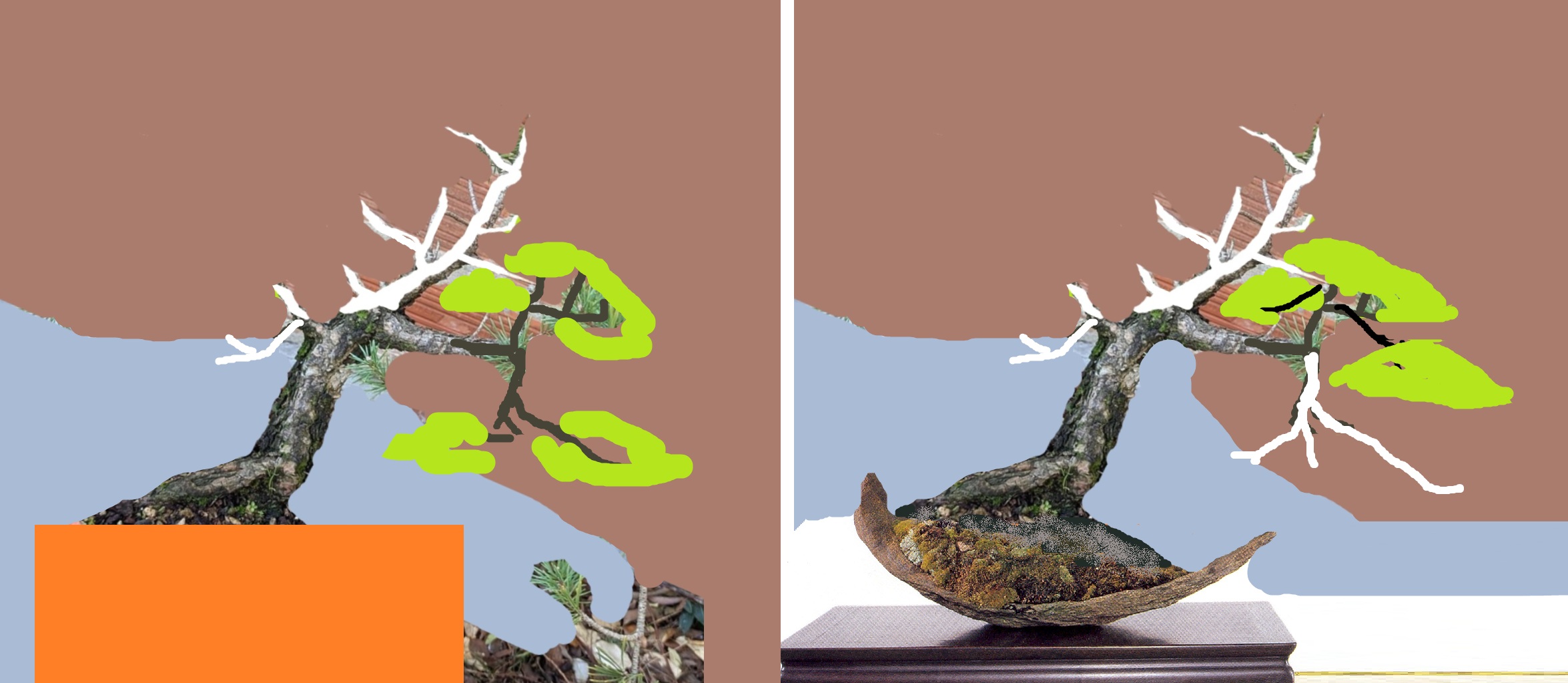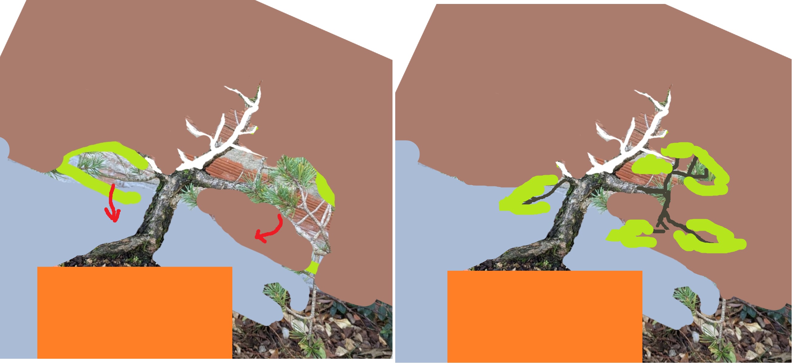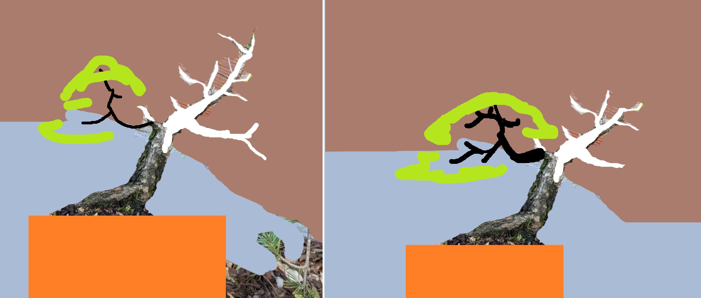 Cela fait maintenant plusieurs semaines que je tourne autour et je nâarrive pas Ă choisir une direction . Est ce que je sĂ©lectionne la branche qui part Ă droite et je fais un jin dans la continuitĂ© du tronc , ou est ce que je poursuis le tronc et transforme la branche de droite en jin? Est ce que je garde les 2? (Vraiment pas sĂ»r de cette option ) La face marquĂ©e sur le pot (photo1) est celle choisie par le site de vente , mais ce nâest pas celle que je choisirai je pense ..