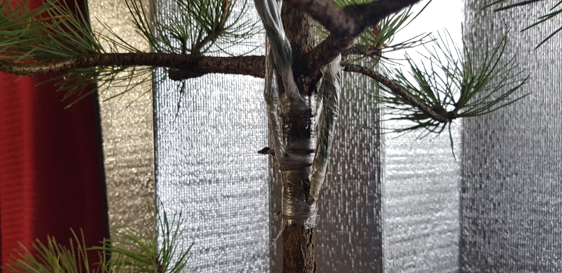 Sur les pins et junip ça me semble compliqué de percer car il faudrait faire un trou enorme pour passer le bout du greffon emballé. Par contre les greffes ou tu viens glisser la branche dans une fente marchent facilement!