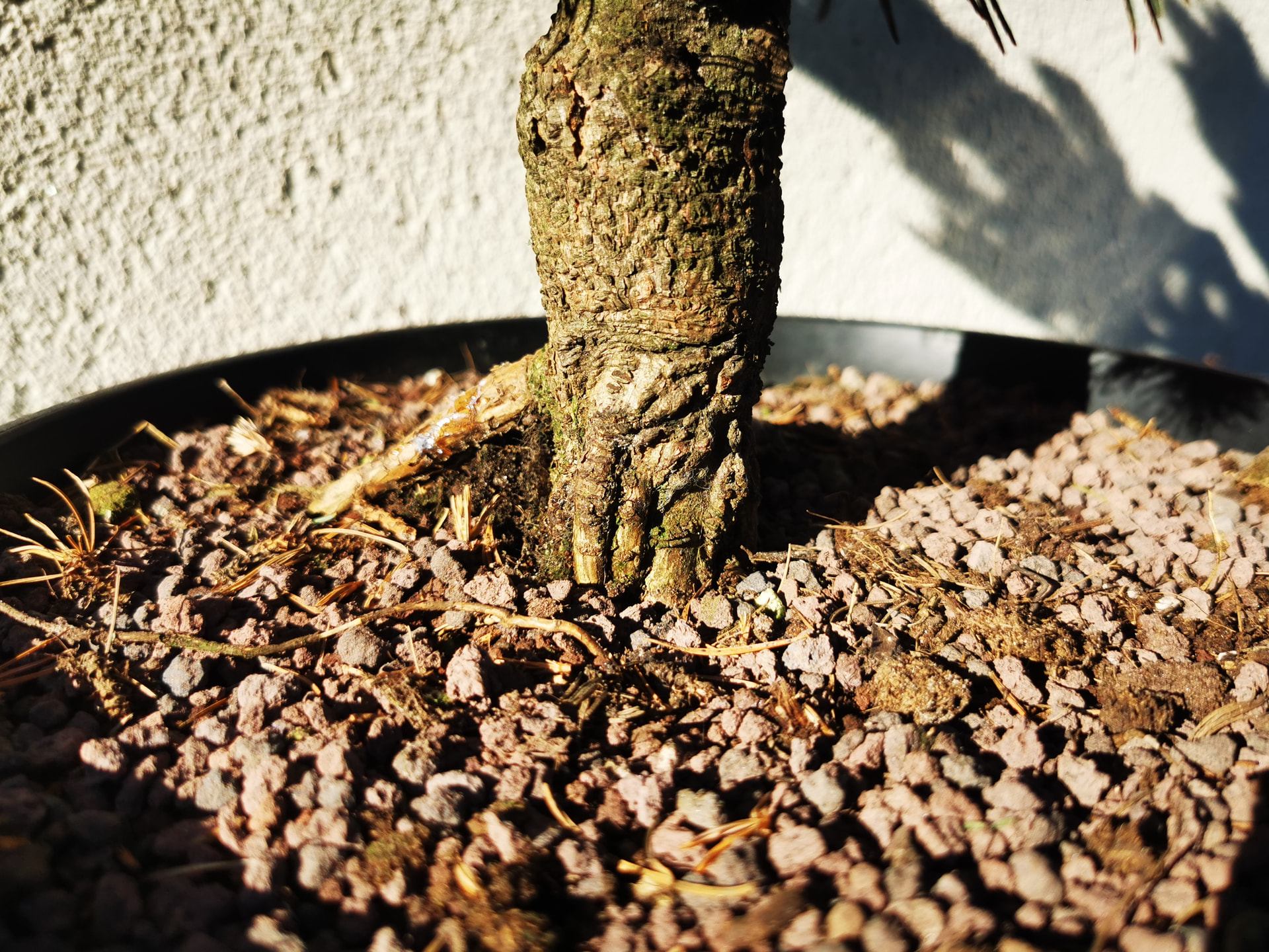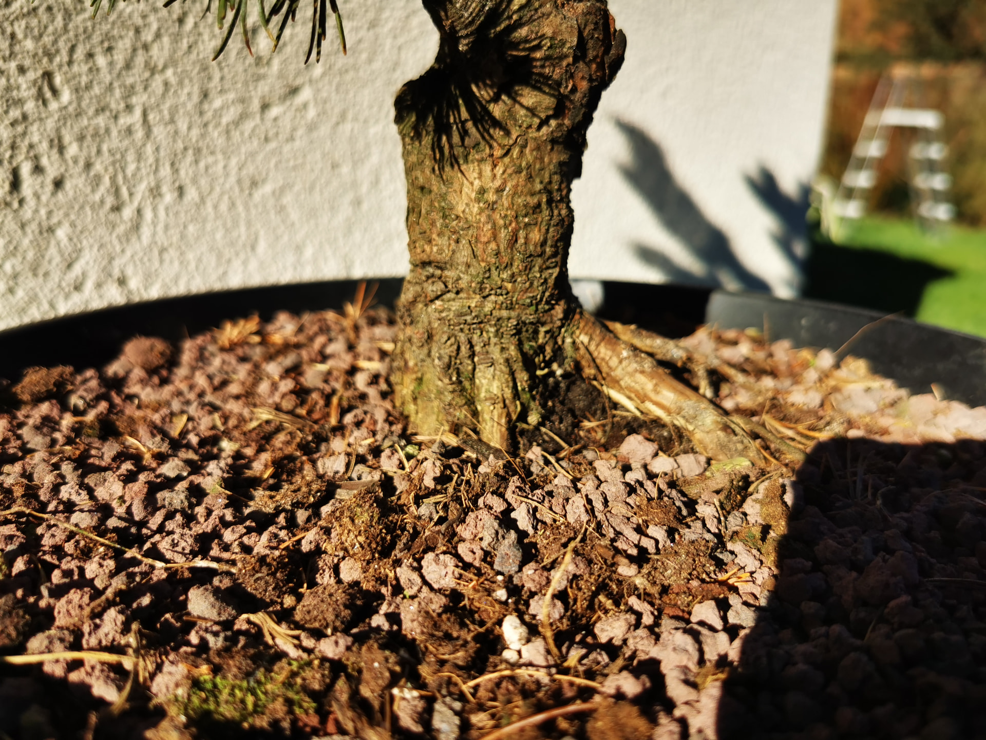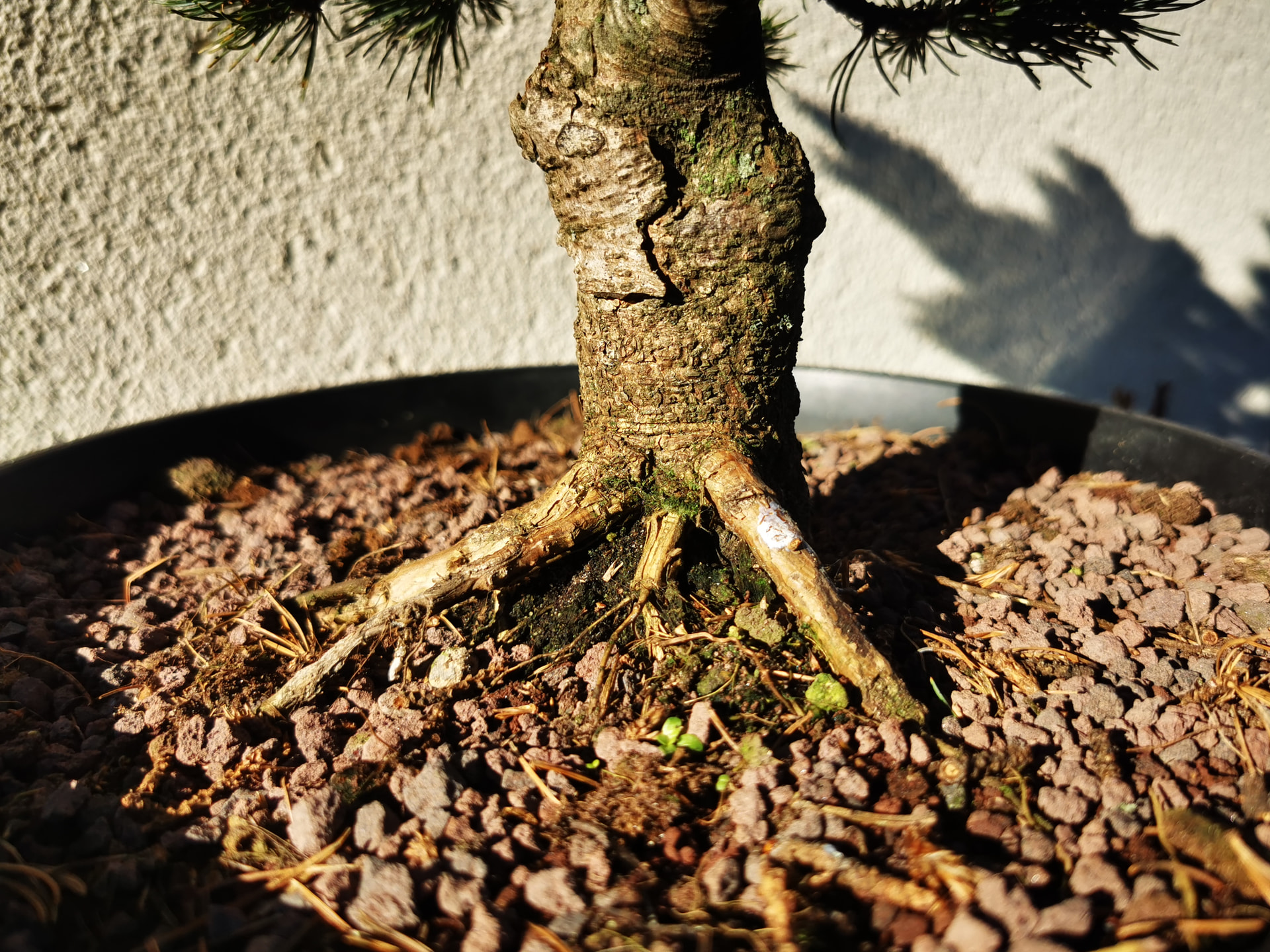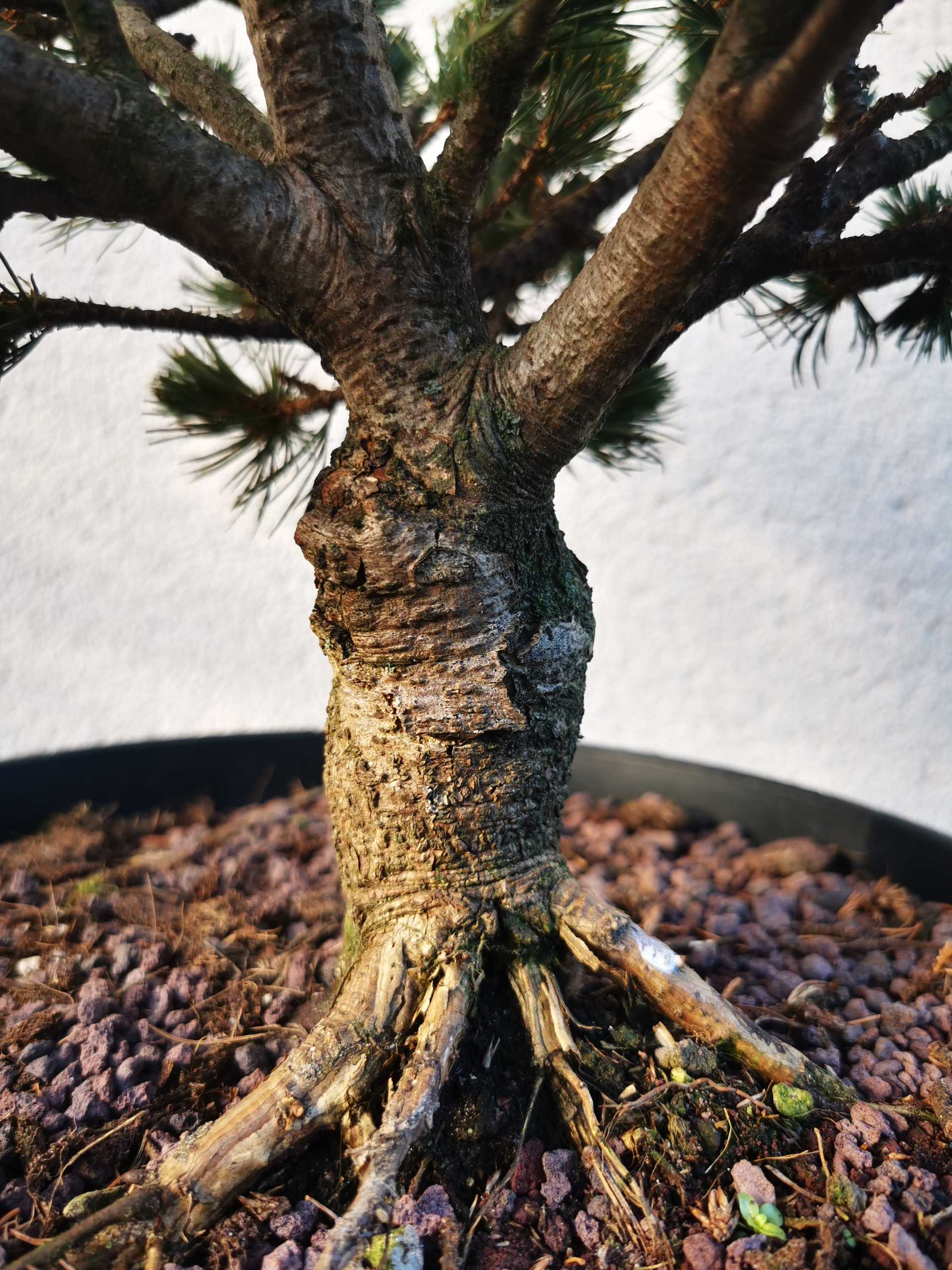 Pas énormément de racines dans ce grand pot mais beaucoup de pointes blanches prêtes à repartir. J’ai laissé une très grosse partie de la motte et rempoté en kiryuzuna/pumice plus une partie de l’ancien substrat. J’en ai profité pour pencher un peu l’arbre du côté où il n’y avait pas de racines apparentes niveau nebari. Croisons les doigts pour la création de racines de ce côté et la reprise générale.