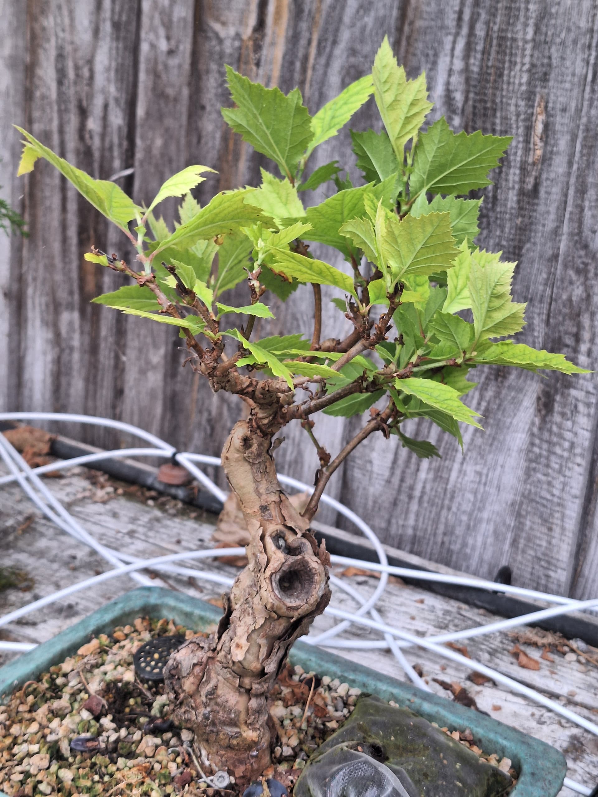 Voilà un arbre que je n’arrive pas à laisser tomber. C’est une marcotte d’une variété de platane nain. Il es planté dans mon jardin depuis 25 ans et ne mesure que 2m. Le souci est cette lenteur de croissance, du coup pas de ramif… le tronc est sympa, j’ai encore raccourci le tout.