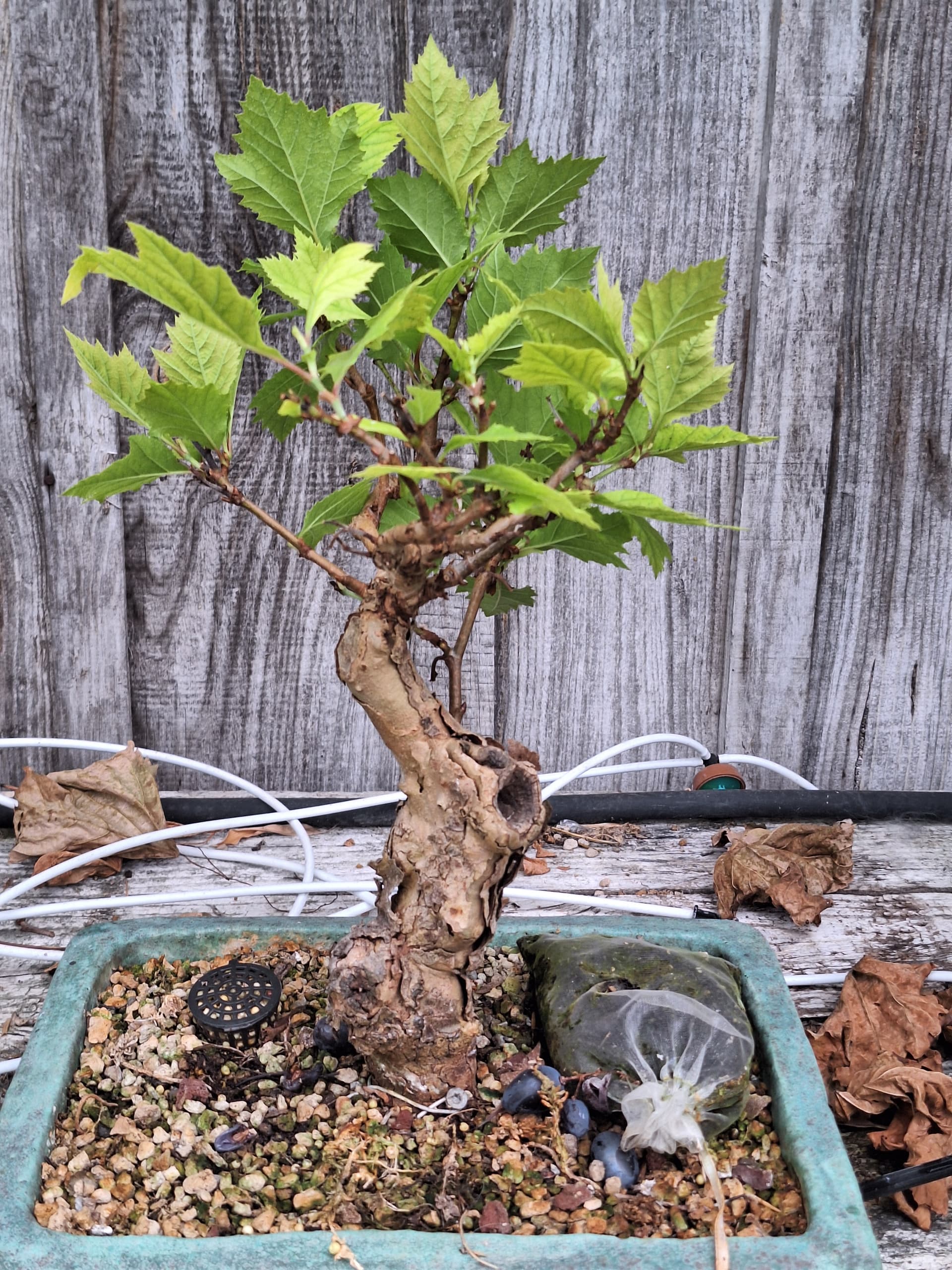 Si j’avais eu à débuter un arbre comme ce (mon) liquidambar, je serais parti sur un arbre plus haut (80 à 100 cm) de façon à ce que la taille des feuilles sont moins disproportionnées.
