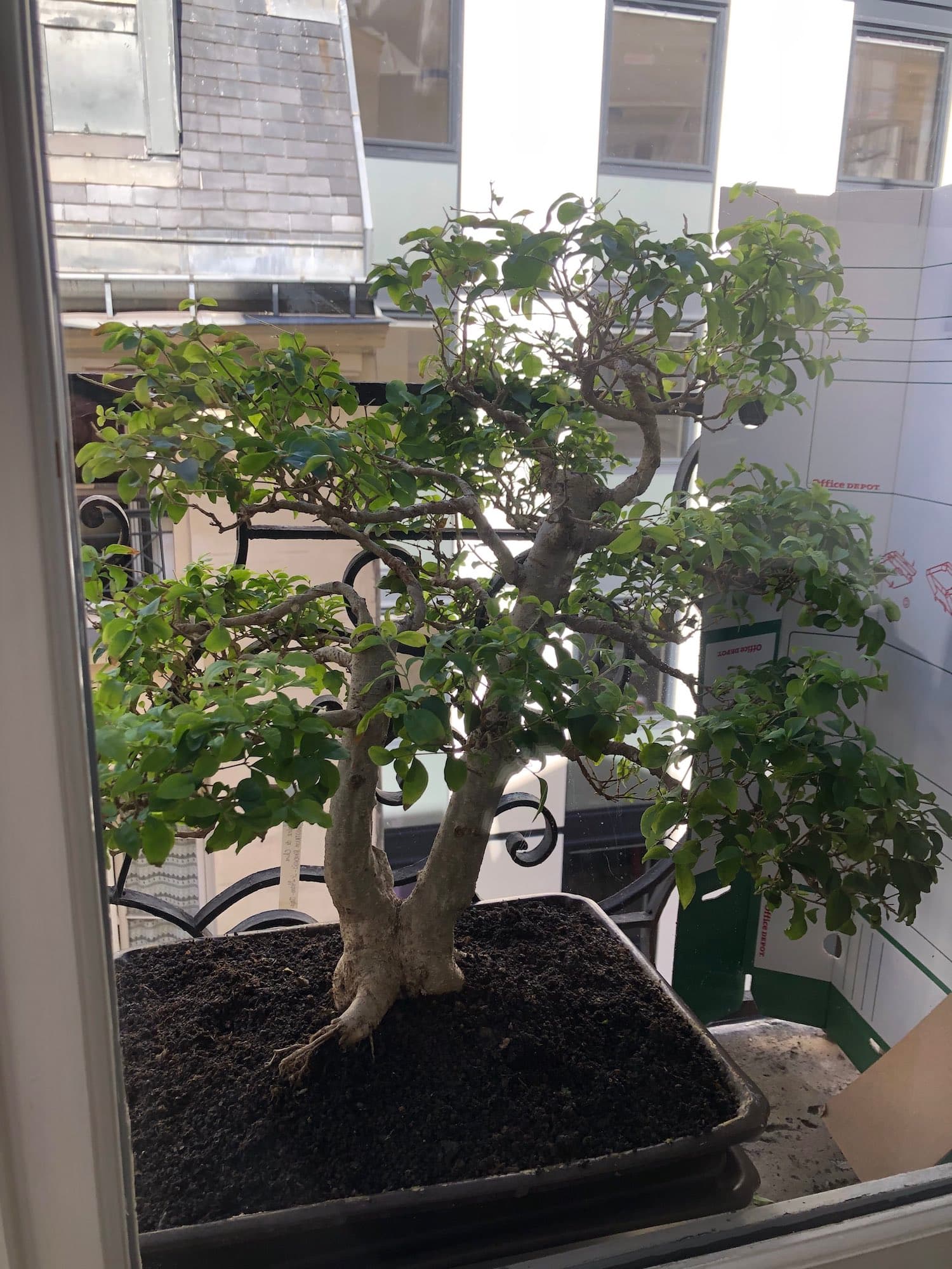 Dommage que tu ne dispose que d’un rebord de fenêtre, un balcon aurait été plus adapté pour lui faire un coin ombragé mais bon on ne choisit pas.. Je te déconseille un rempotage maintenant, si l’arbre est faible la reprise risque d’être plus compliquée, sachant que si tu le rempote les racines seront démêlées en plus d’être taillées, un rempotage reste toujours une opération stressante. Le plus sage serait d’attendre la fin d’hiver ou le début du printemps, l’automne prochain reste une possibilité. Peut être que d’ici là si tu agis sur un des paramètres de culture évoqués plus haut la situation va s’améliorer et de permettre de temporiser son rempotage. Si tu le déplace sur ton bord de fenêtre fixe le de manière sûre, pour sa sécurité et ceux des passants