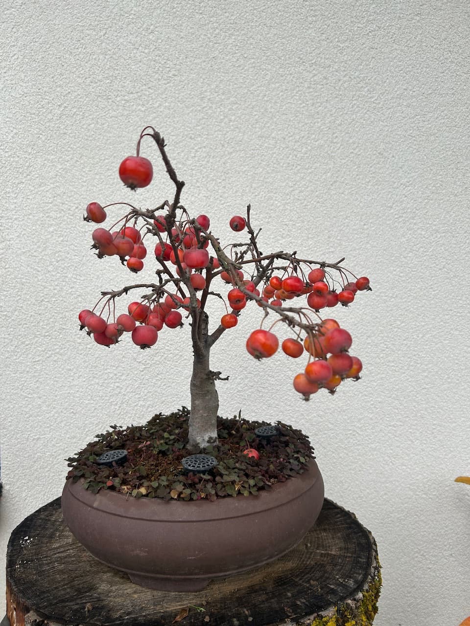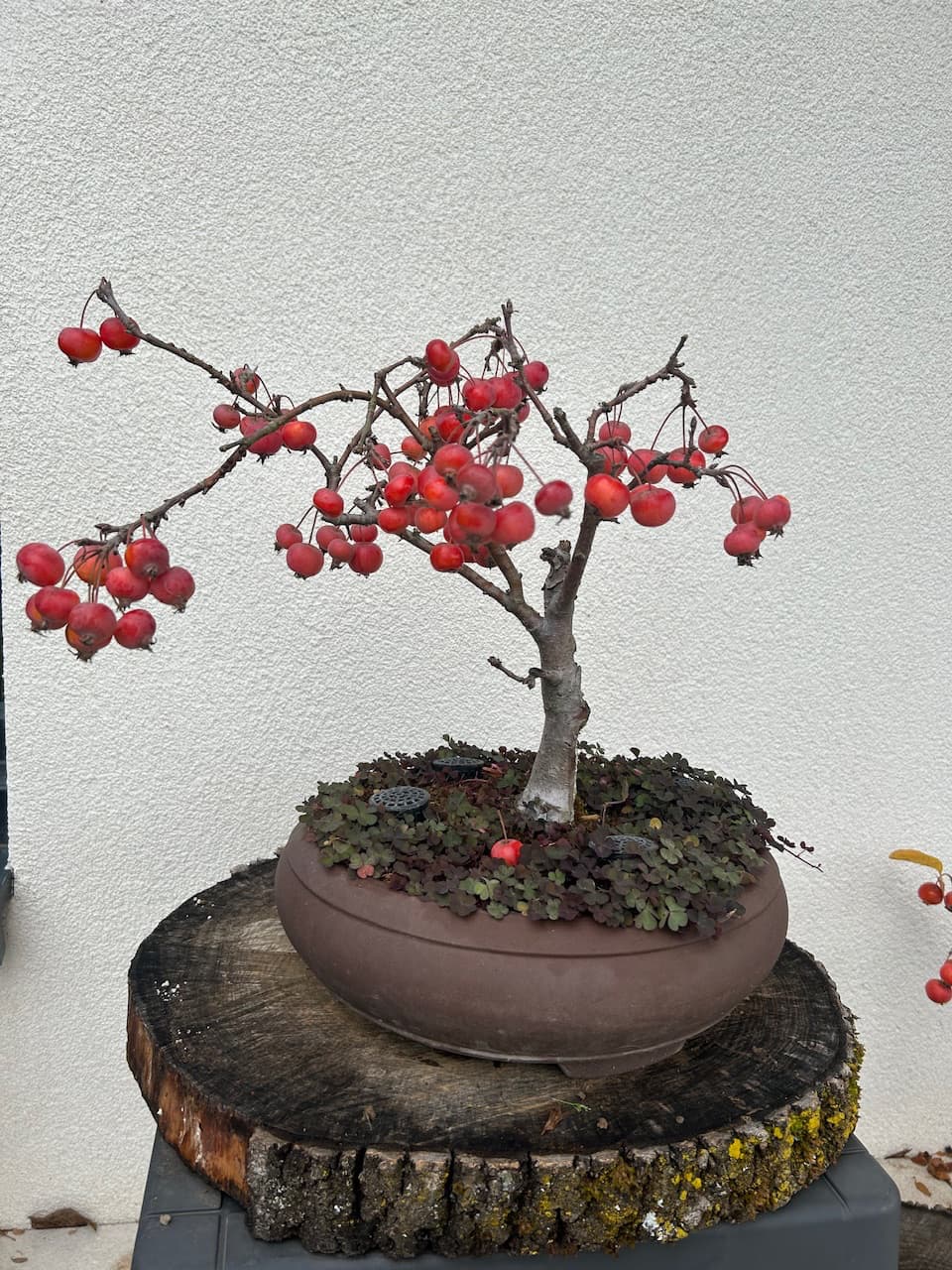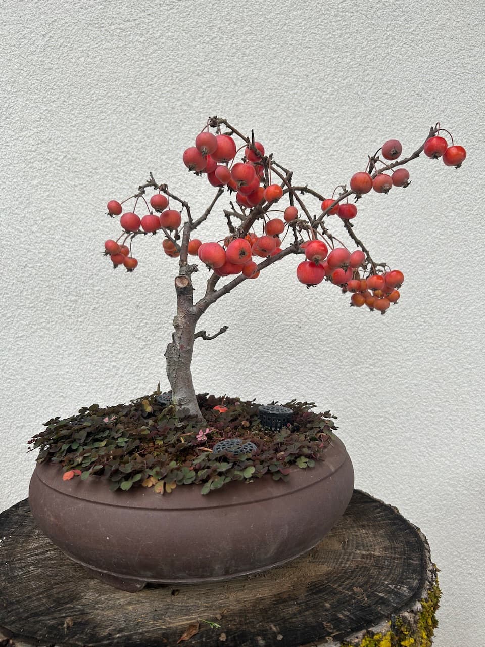 Il me donne chaque année beaucoup de fleurs et de nombreux fruits ensuite qui restent jusquau printemps suivant. Je sais que normalement il faut en enlever une partie pour ne pas épuiser larbre mais cest tellement beau et cest ce qui donne tous le charme à ce bonsaï…