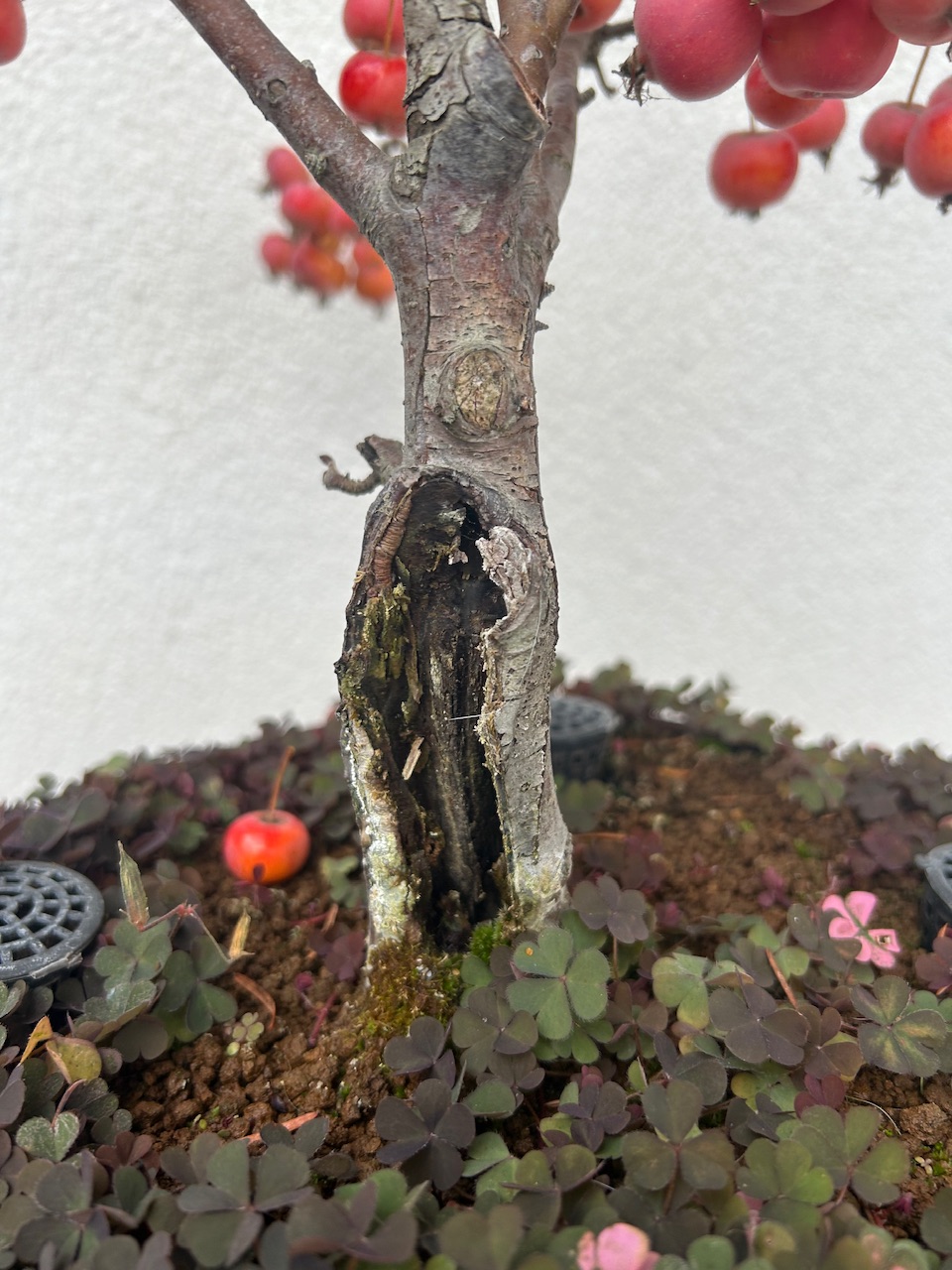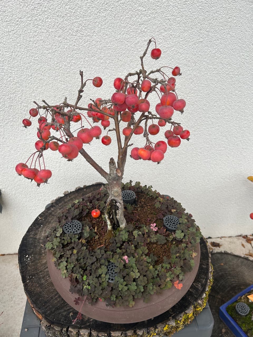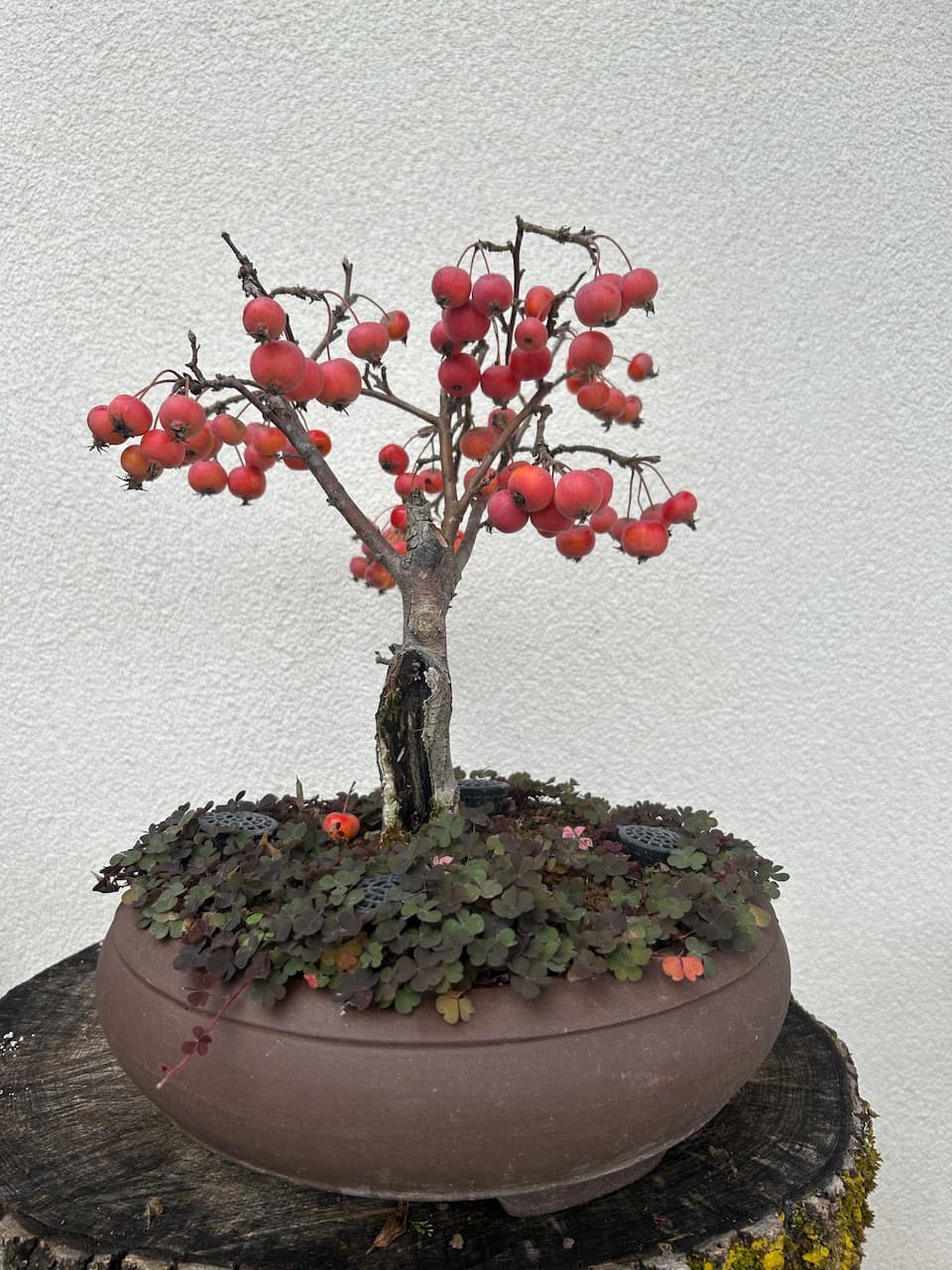 Il me donne chaque année beaucoup de fleurs et de nombreux fruits ensuite qui restent jusquau printemps suivant. Je sais que normalement il faut en enlever une partie pour ne pas épuiser larbre mais cest tellement beau et cest ce qui donne tous le charme à ce bonsaï…
