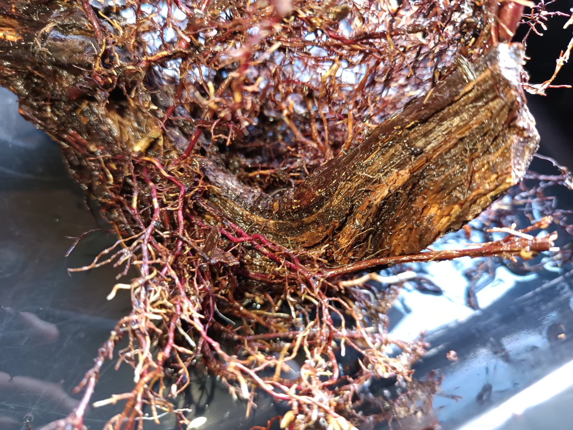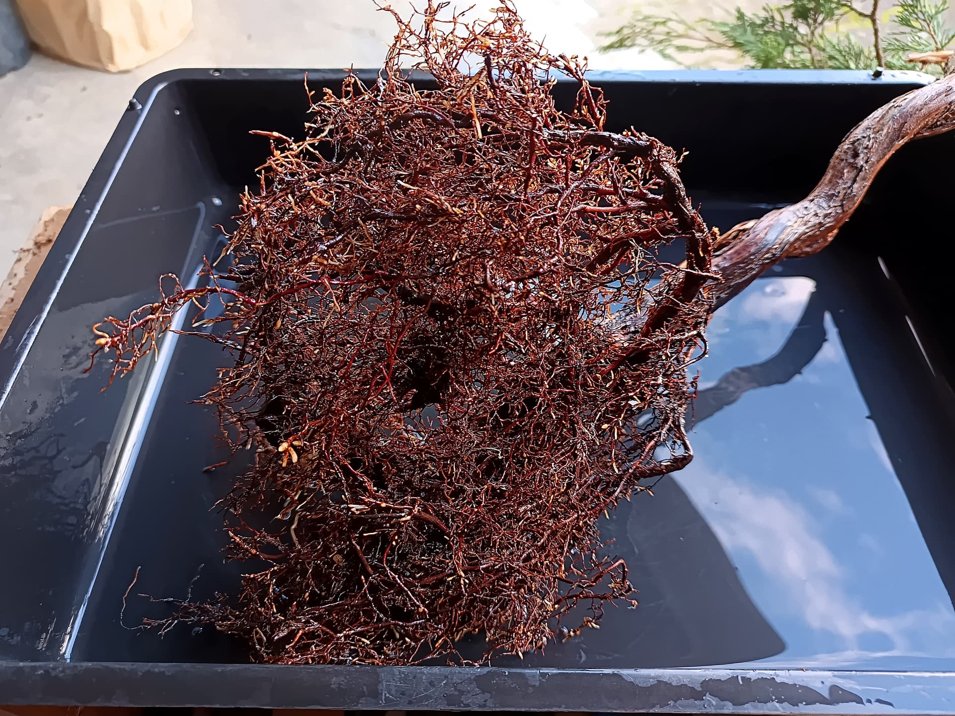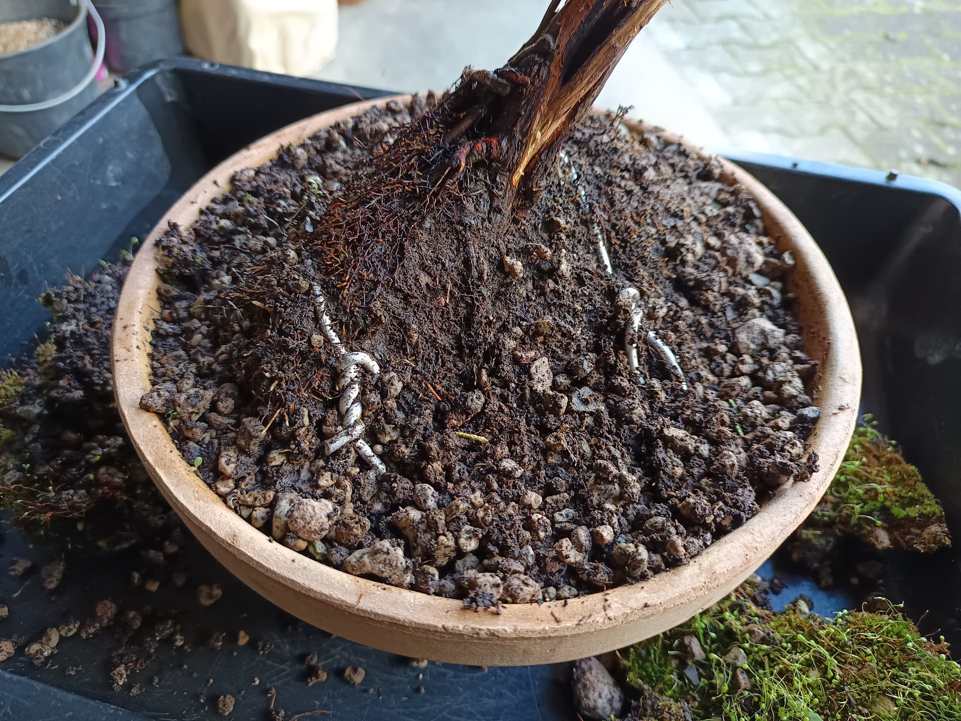 Voilà le travail du racinaire est terminé je peux procéder à la mise en pot, je choisis un pot plat adapté au style Bunjin, esthétiquement il est beaucoup trop gros mais adapté à ce stade pour accueillir le volume racinaire que je veux garder en totalité