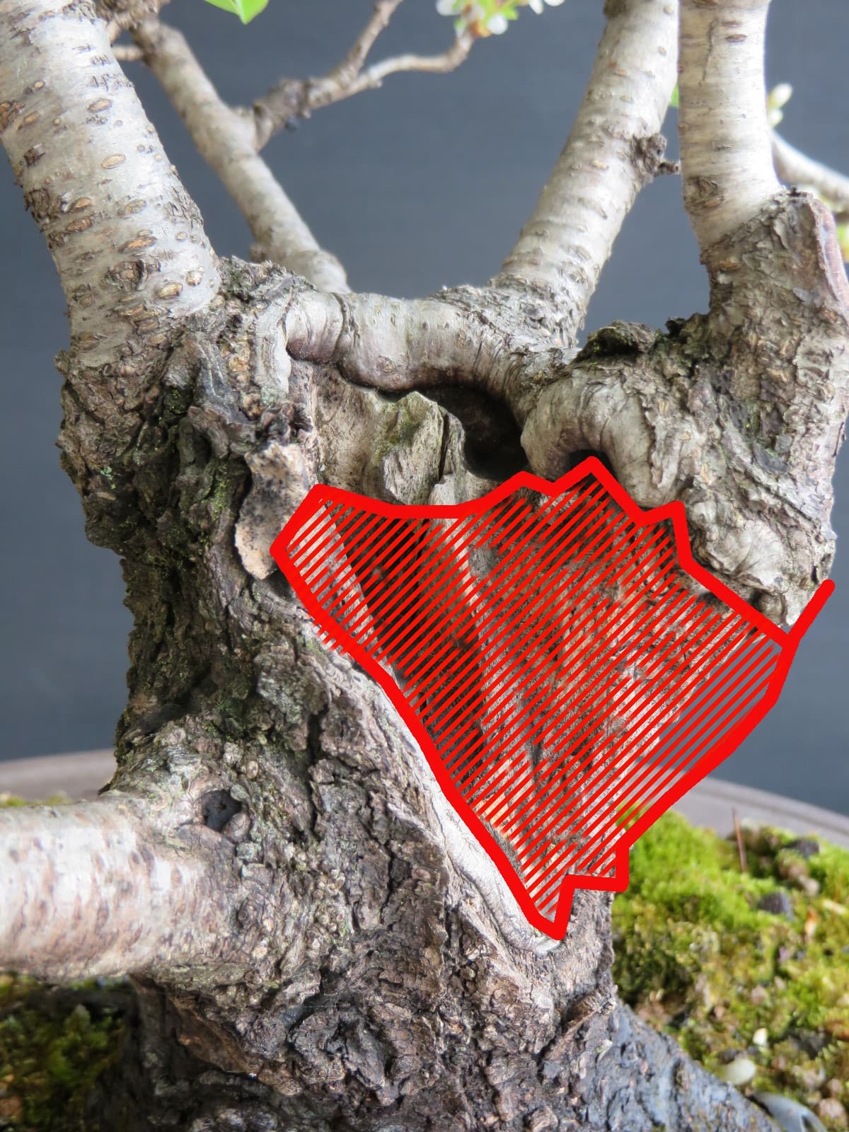 Après avoir éliminé les départs non pertinents il a fallu casser cette structure. J’ai choisi d’éventrer le tronc. Le cliché suivant montre le début du travail. La branche qui monte à droite posait problème, car son départ correspondait à une boursouflure.