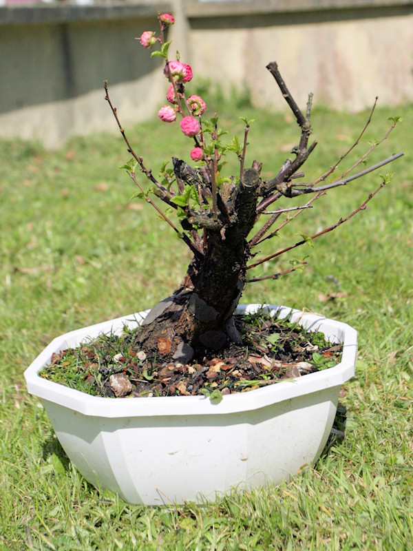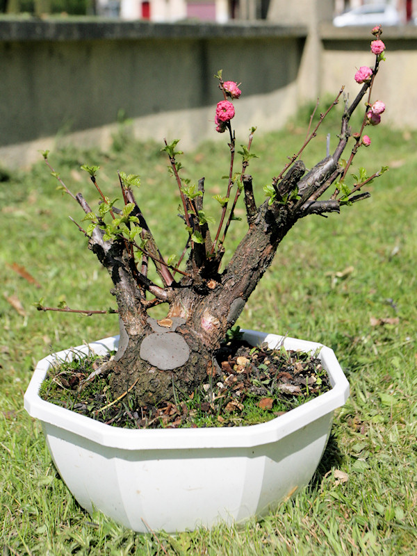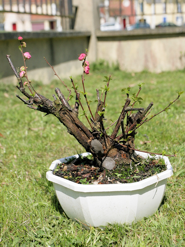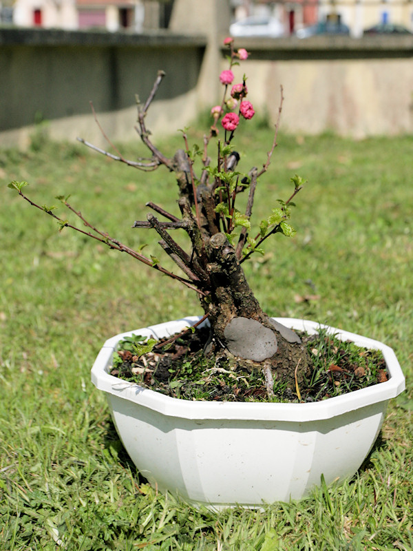 Prunus triloba (Amandier de Chine) acheté cette hiver. Pas rempoté ce printemps donc je n’ai que peu d’info sur le nebari…