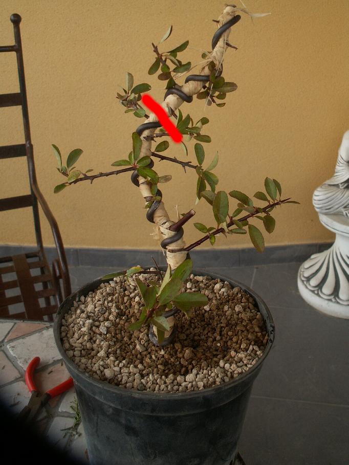 Je viens de rempoter (dans du chabasai) et de mettre en forme (pour m’entrainer) un plan de pyracantha.