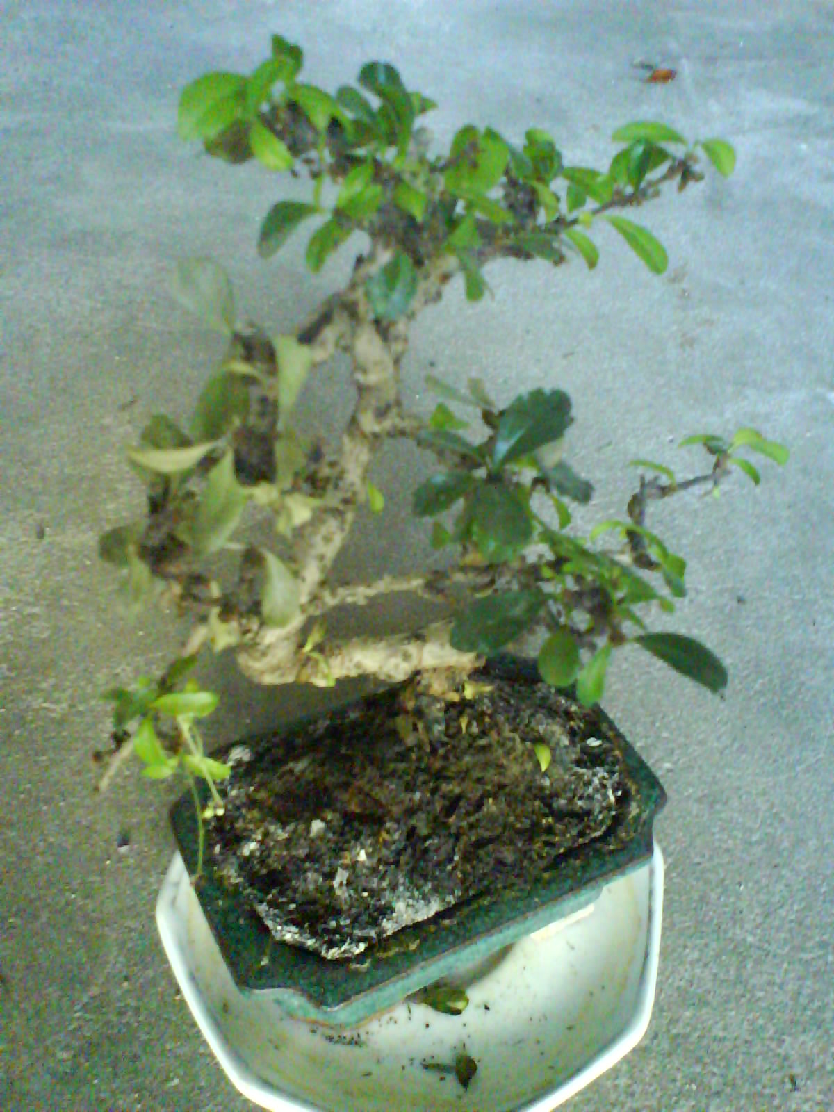 Je suis tout nouveau sur ce forum et j’espère que certains pourront m’aider pour répondre à mes interrogations. Voilà, je me suis vu offert à Noël, un bonsaï acheté à Truffaut. Lors de l’achat, les vendeurs ont signalés qu’il s’agissait d’un bonsai d’interieur. J’aurais d’abord aimé savoir de quel espèce il s’agit. J’ai mis des photos dans l’espoir que ça vous aide. Cet arbre n’avais pas beaucoup de feuilles quand je l’ai eu, et il n’en a pas beaucoup maintenant, certaines commencent même à tomber.Je trouve qu’il est mal en point. La composition de la terre du pot est d’origine et je ne sais pas ce que c’est ni si ça lui convient.
