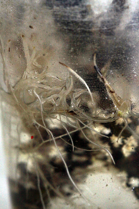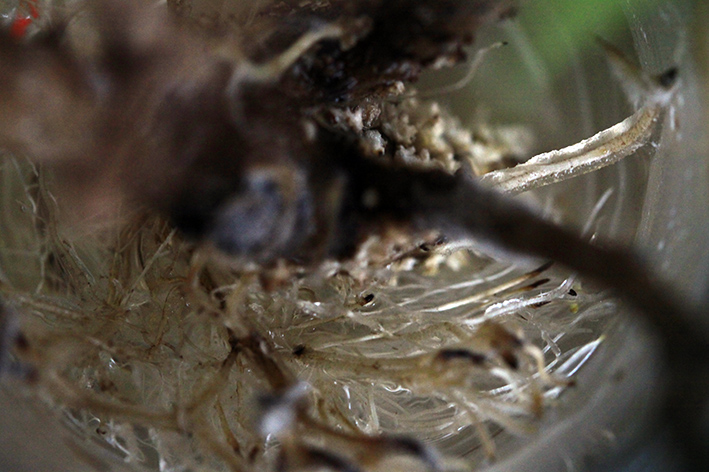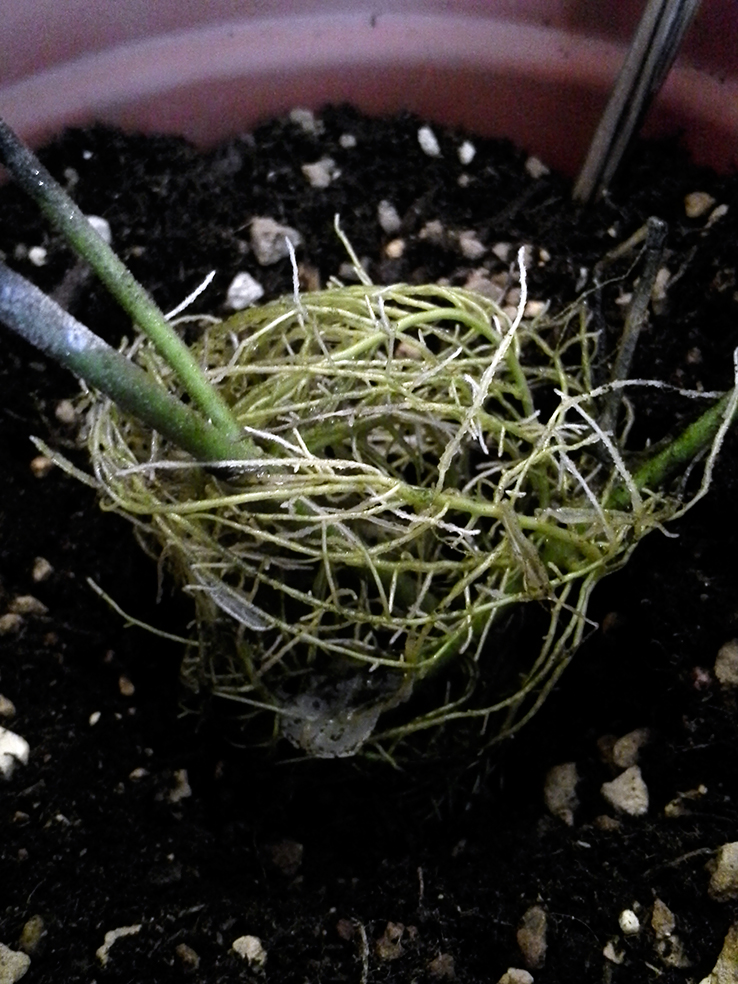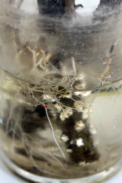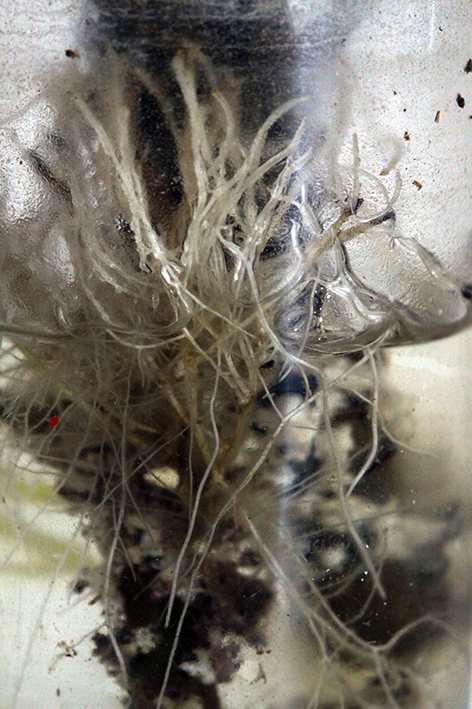 Les racines poussent bien, elles sortent à la base des feuilles coupées et on peut même apercevoir que la plante fait de nouvelles pousses ...