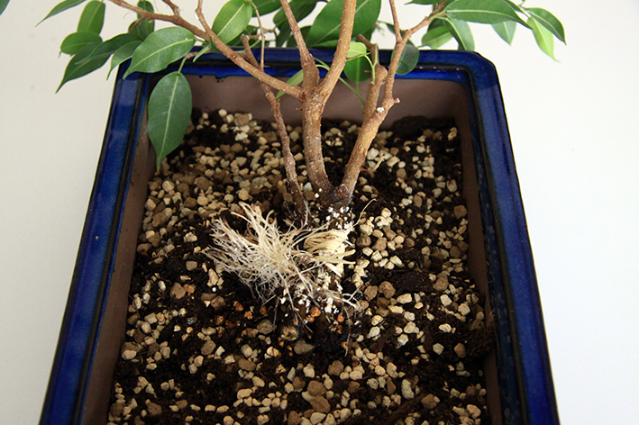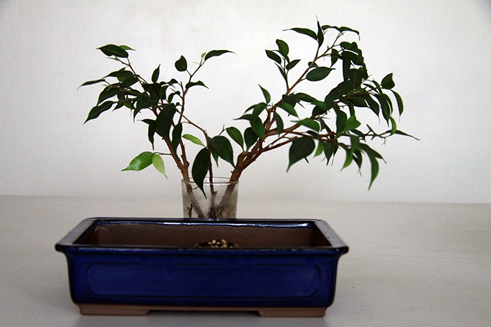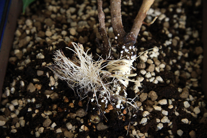 et comme les racines se sont bien développées, je les ai mises dans le pot qui se trouve derrière le verre dans un mélange d'akadama, kyriu,terreau et kanuma :