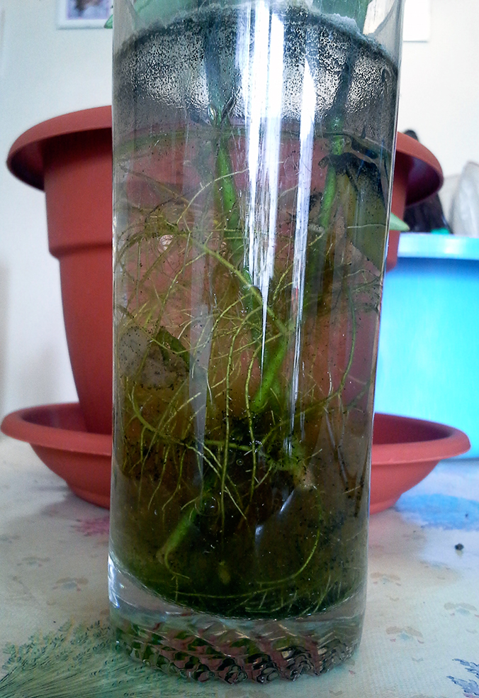 J’ai mis ces deux boutures telles quelles dans l’eau sans rien toucher pour avoir le maximum de chances de reprise .