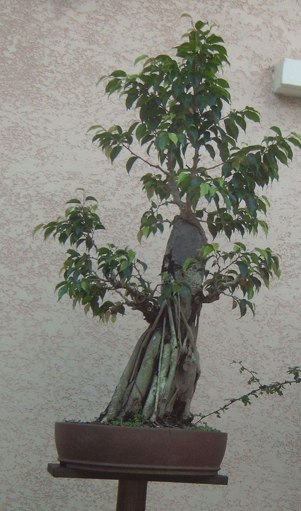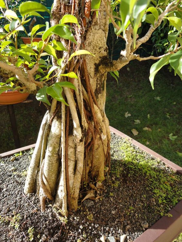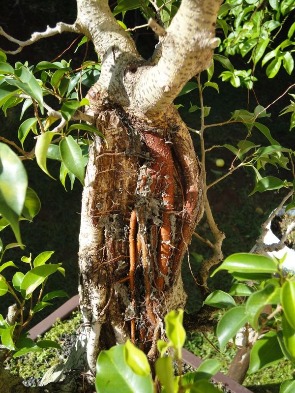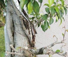 Au cours de cette période allant de mars 2010 à décembre 2010, je vois que dessous ce scotch il se passe des choses, comme c’est la période humide ici, le ficus fait seul des racines aériennes mais peu n’arrive jusqu’au sol. Malgré cela j’en trouve pleins qui sont sur la face arrière, au niveau de la grosse coupe et qui commence a bien descendre et à forcir. Je laisse le tout car je veux pas tout décoller…