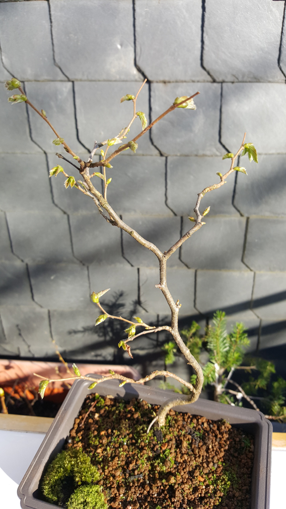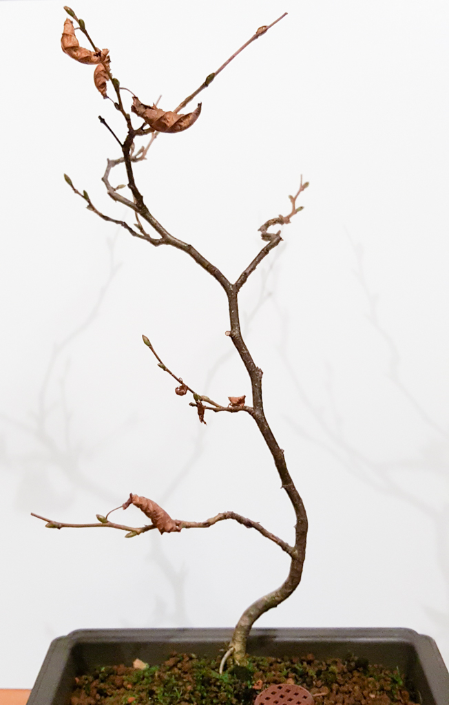 Taillé en janvier (constaté des branches mortes), rempoté en avril. Débourage en mai, feuilles plus petites.
