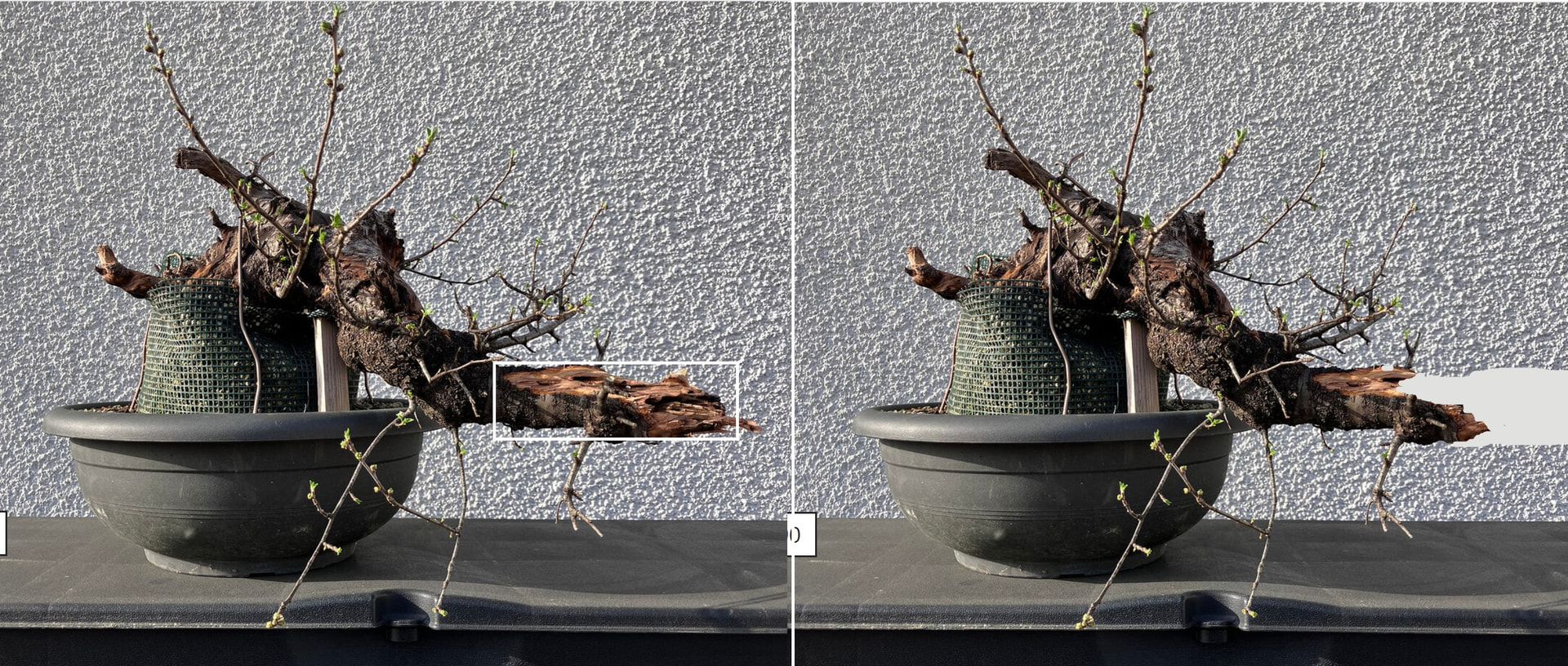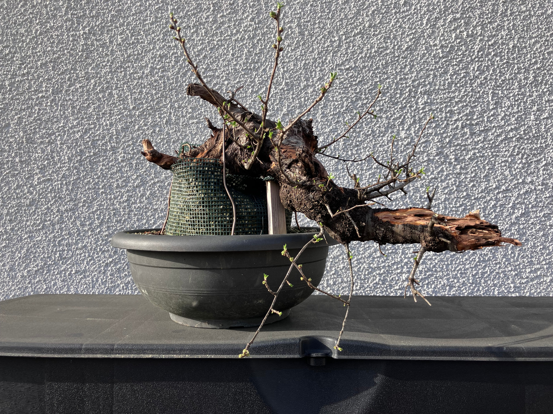 Non, c’est parce que je l’ai fortement couchée (initialement, c’était un arbre penché à environ 30° par rapport à la verticale). Le racinaire arrivait (au dernier rempotage) globalement au bas du grillage, et je souhaitais qu’elle est un large volume disponible ensuite pour monter en vigueur.