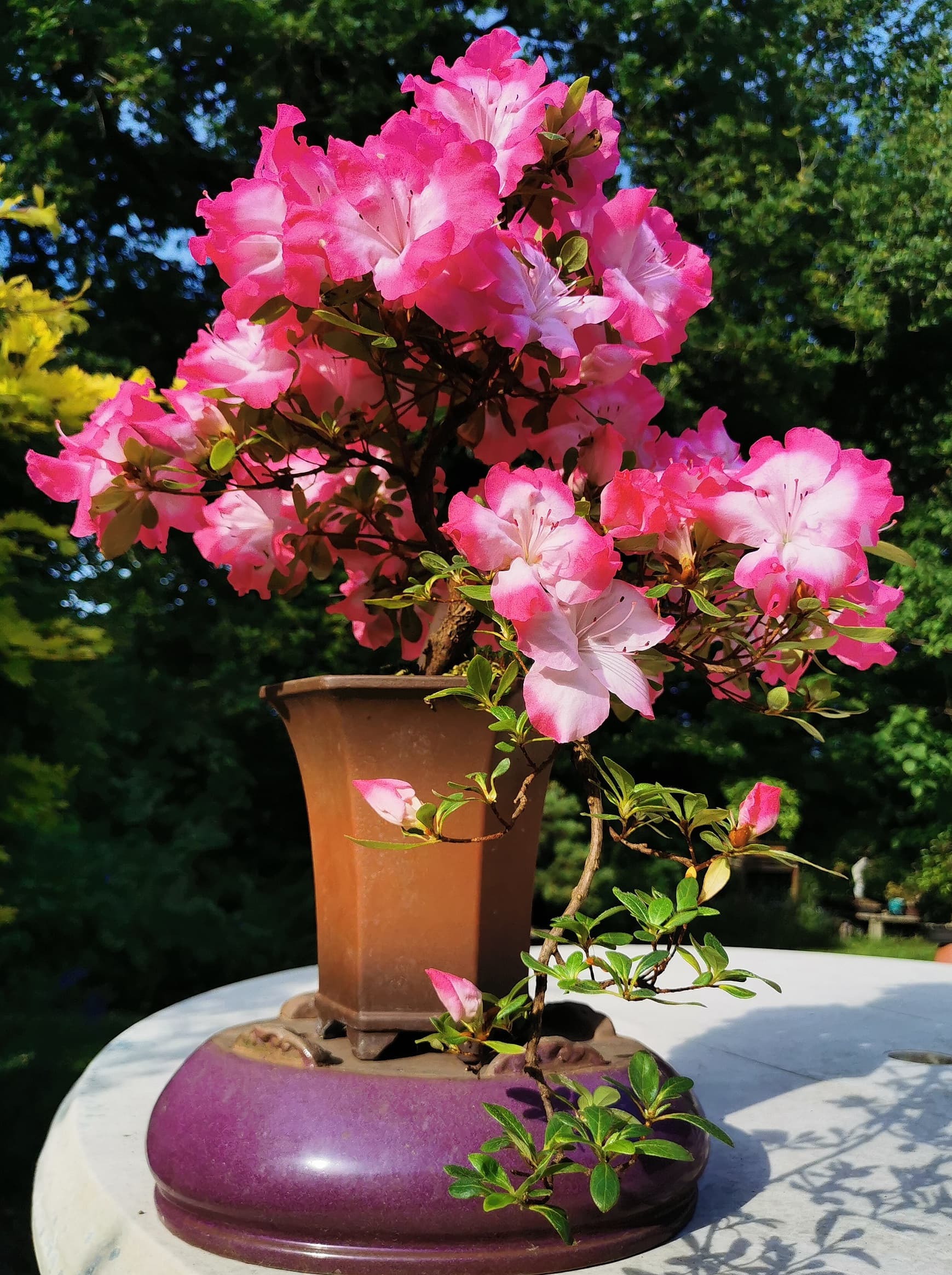 Une satsuki que je conduis en cascade, je suis parti d’une bouture il y a 8-9 ans de mémoire, elle me fait une opulente floraison cette année, je me laisse encore en profiter quelques jours avant sa suppression. C’est long à construire les satsuki, mais leur floraison compense largement les efforts.