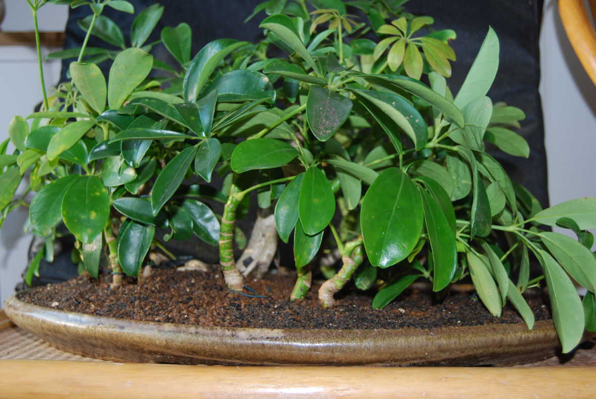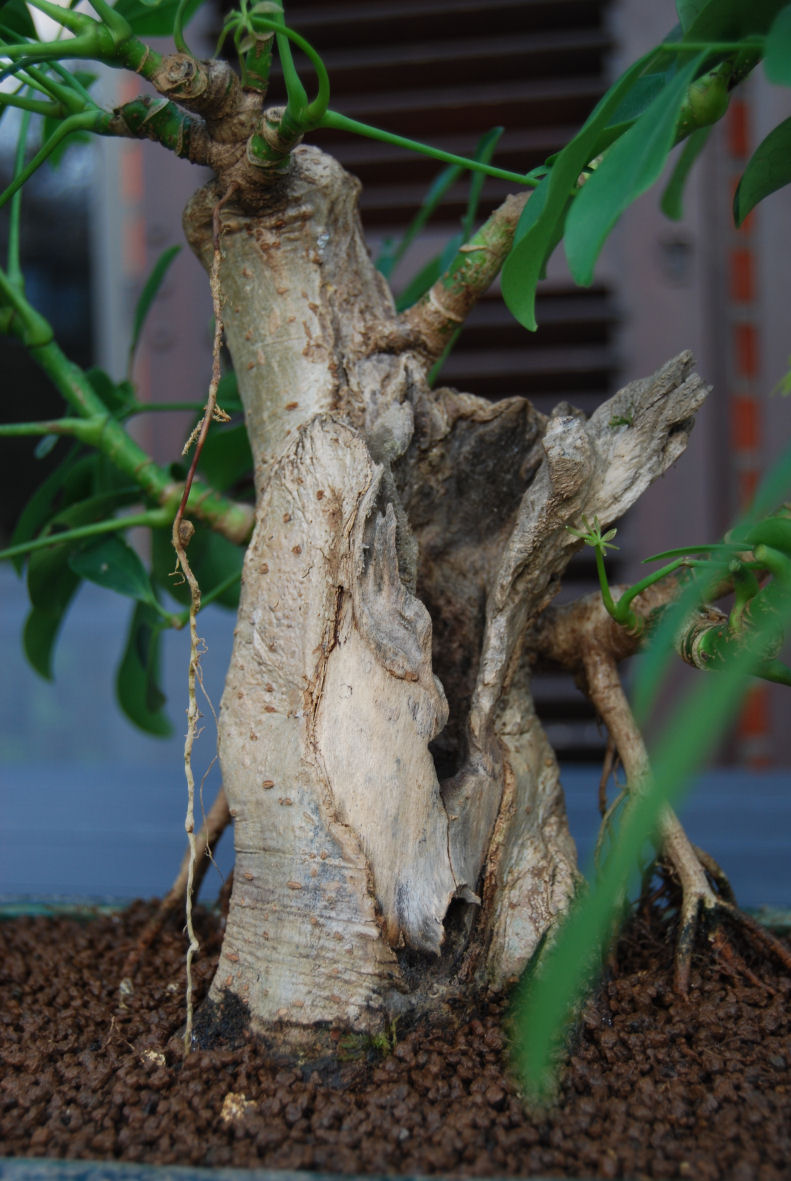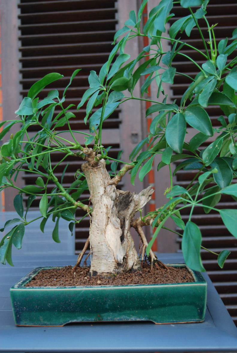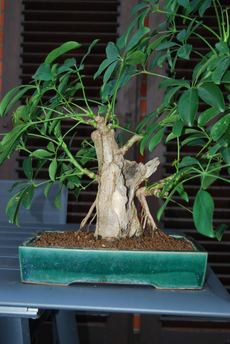 J'ai bien en tête des images de forêts de schef faites avec des boutures comme la mienne mais plus hautes. Rien que dans un de mes premiers bouquins de bonsai, un vieux de Rémi Samson. Tous ces tubes gris sans mouvements ne me plaisent pas du tout. Je voulais éviter ça à tout prix.