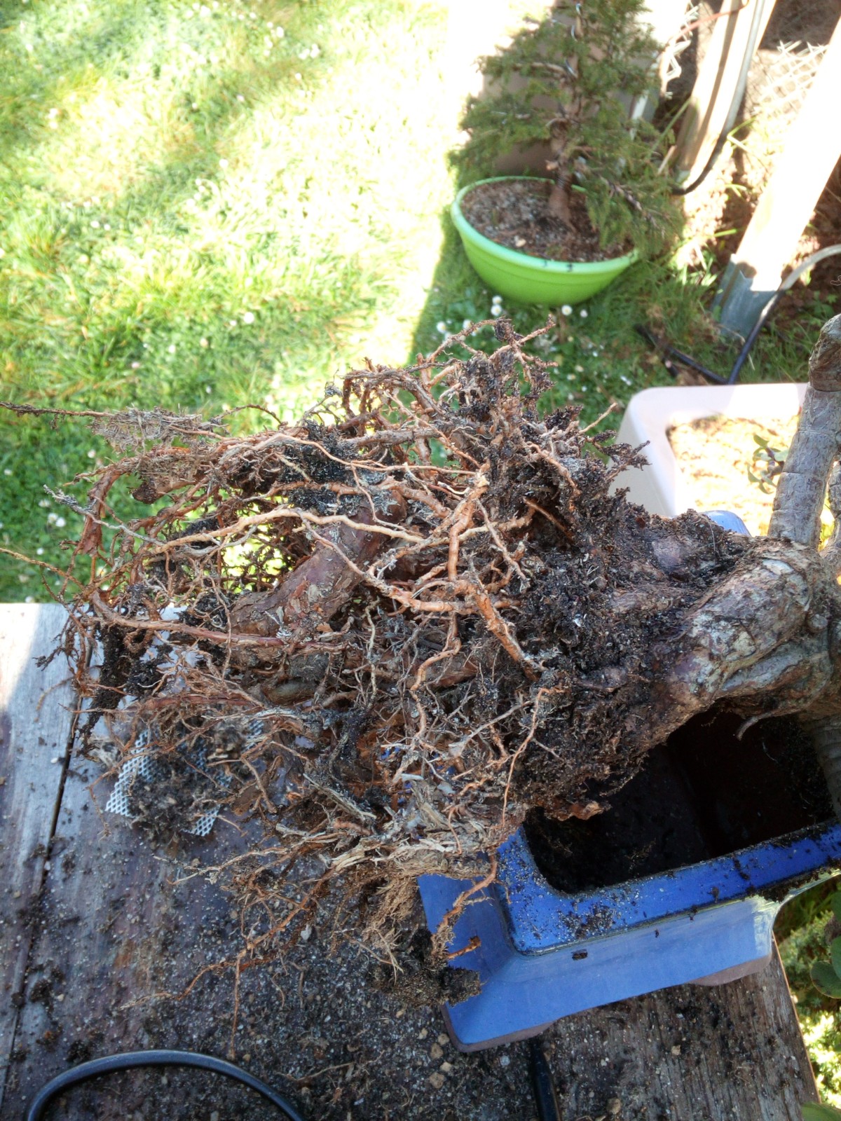 Le substrat, passé une croûte dure, n’était pas si mauvais, composé en bonne partie de sable, et le racinaire n'est pas mal non plus. J'ai juste rogné la grosse racine plongeante.
