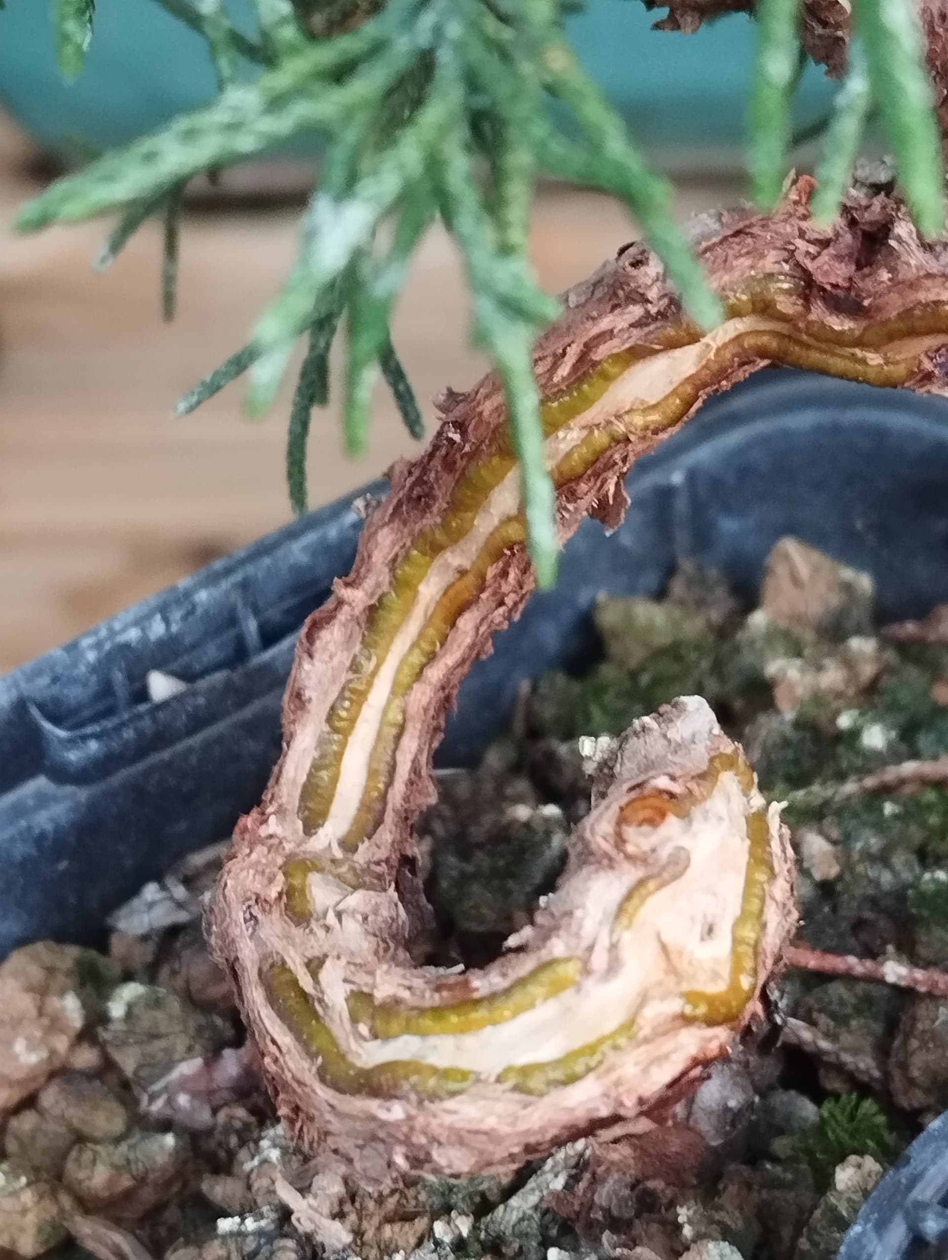 c 'est toi qui vois, mais si tu laisses la ligature s’incruster, et donc une veine vivante se former qui va ainsi spiraler autour du tronc, non seulement tu ne risques rien ensuite (lorsque tu feras ton shari dans le trou creusé par la ligature) et en plus tu auras un arbre ‹ naturellement › spiralé. Tandis que si tu fais ton shari maintenant, les fibres de bois mort seront longitudinales et non pas transversales comme il se doit chez les juni des montagnes.