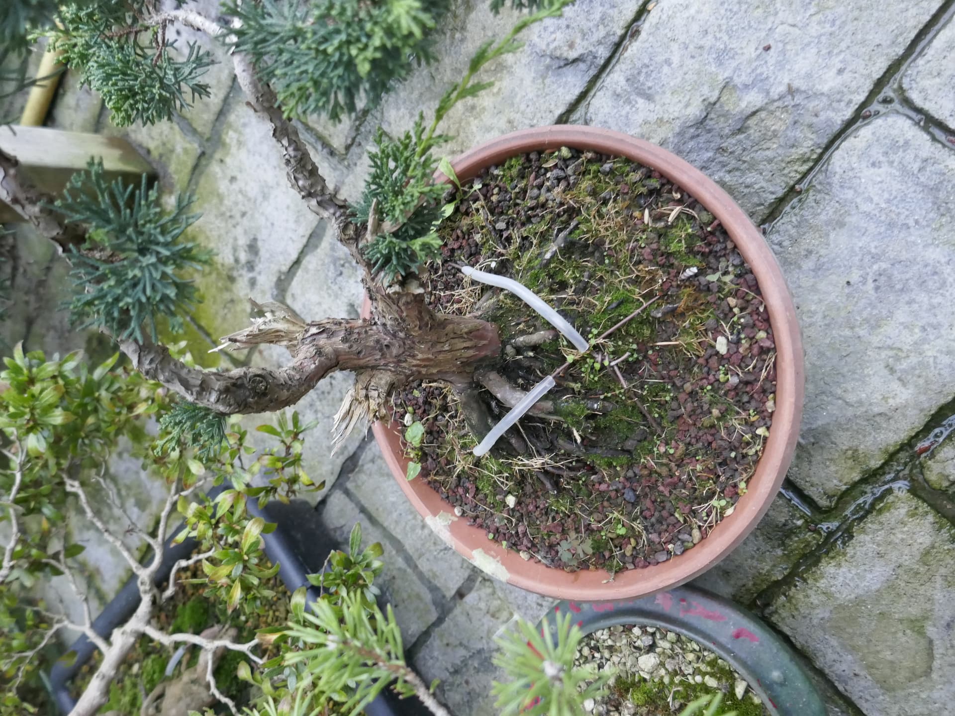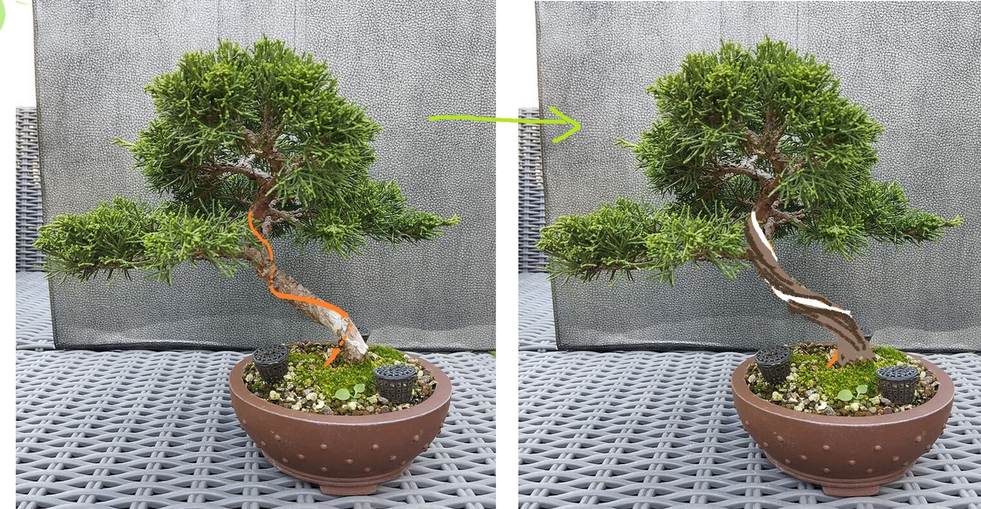 Par contre avec la ligature faut être patient vu que l’arbre devra se développer autour de la ligature pendant plusieurs années… ça peut jouer sur ta décision ^^ Quelqu’un qui sait faire pousser fortement un junip aura des résultats plus rapides.
