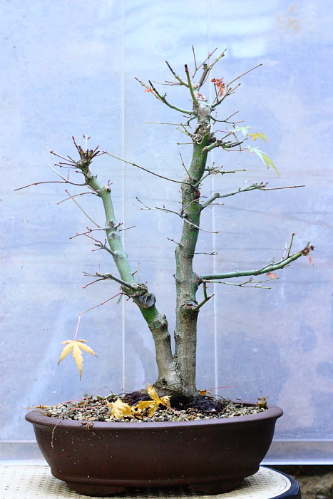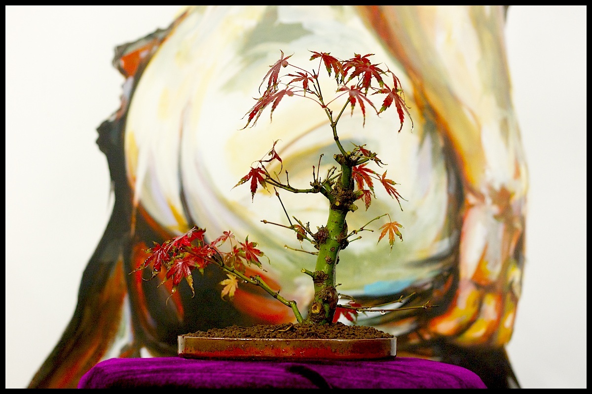 Voici un petit érable du Japon obtenu à partir d’une marcotte et planté dans un pot de Jacques Marty.