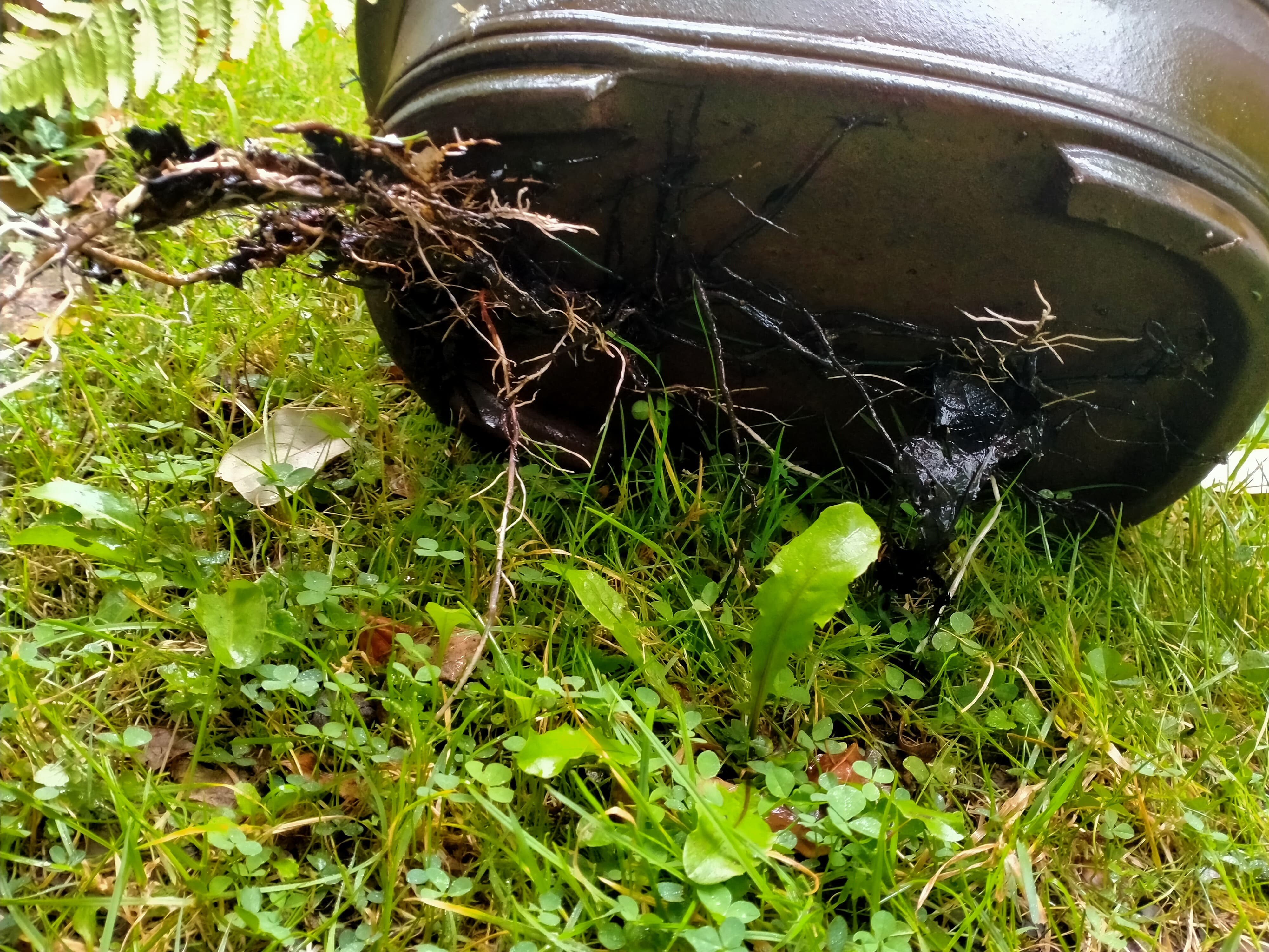 Les racines sont nombreuses à sortir des trous de drainage bien inutiles dans ce cas.