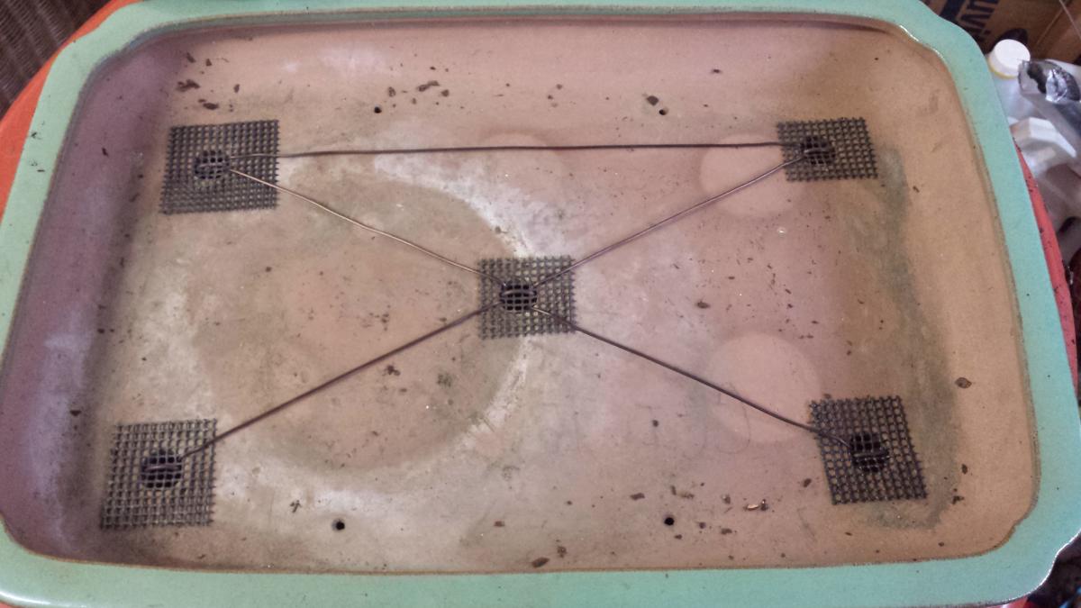 pour préparer le pot, je mets de nombreux fils qui peuvent coulisser, pour essayer de couvrir les besoins pour attacher tous les arbres .