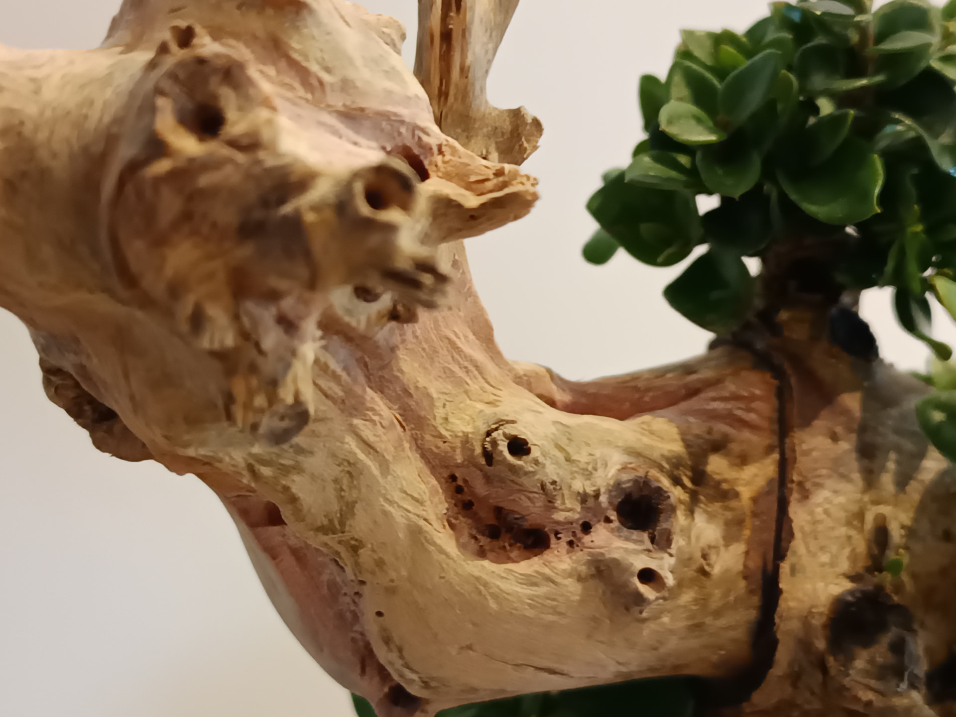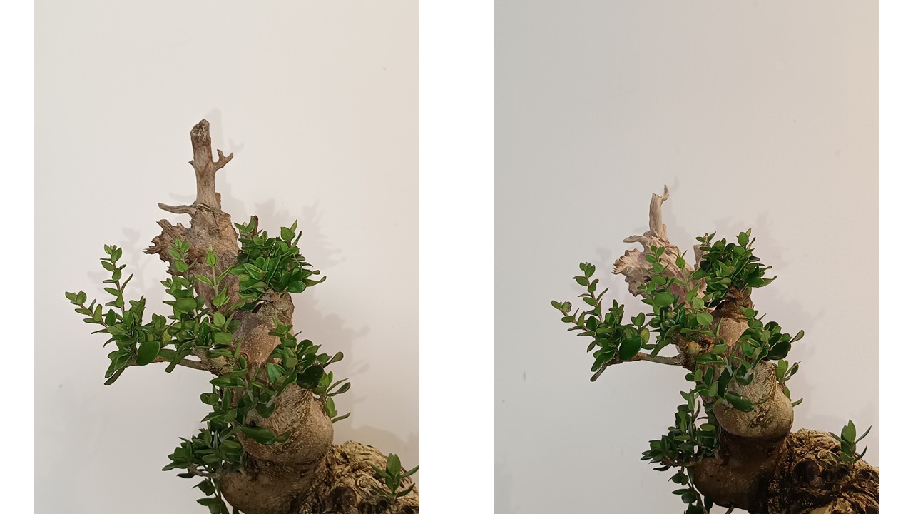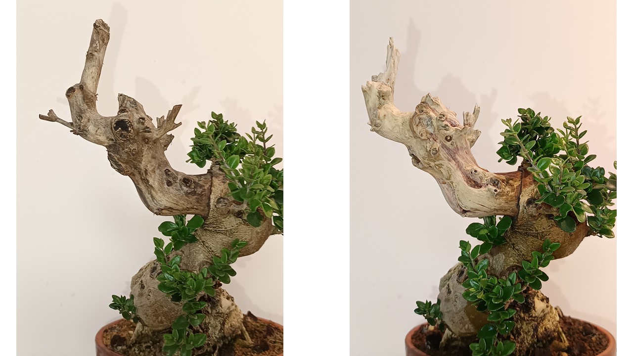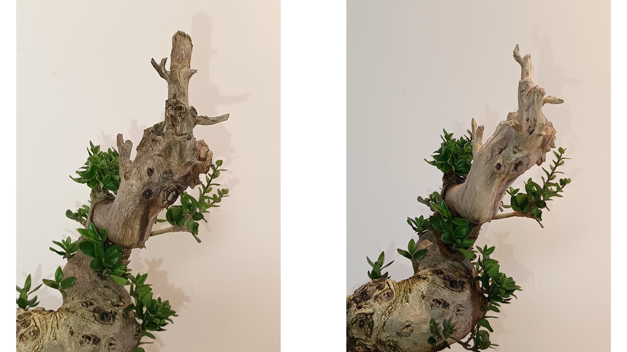 Comme @Marc40 la délimitation bois mort/bois vivant est trop nette pour moi, j’aurais essayé de créer un shari qui se prolongerait dans la zone vivante. Après cette délimitation évoluera dans le temps avec le développement du bourrelet cicatriciel