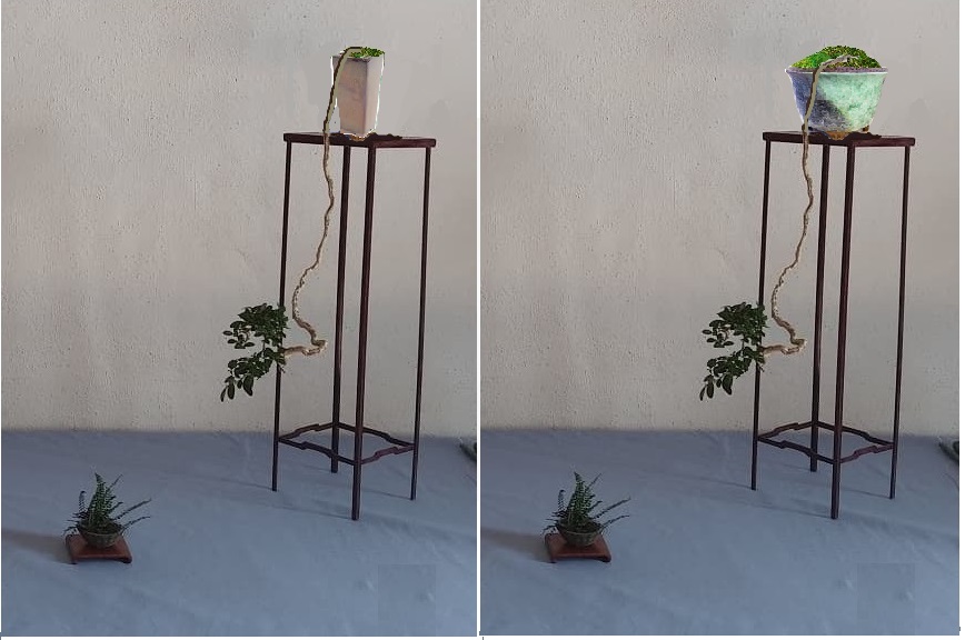 Faire sortir un tronc « Giacometti » d’un pot ventru et massif, c’est un contre-sens, une aberration esthétique. Le fin et svelte naitrait d’une grosse bedaine ? allons bon ! Cela me semble à la fois incohérent et de mauvais gout. Un hiatus .