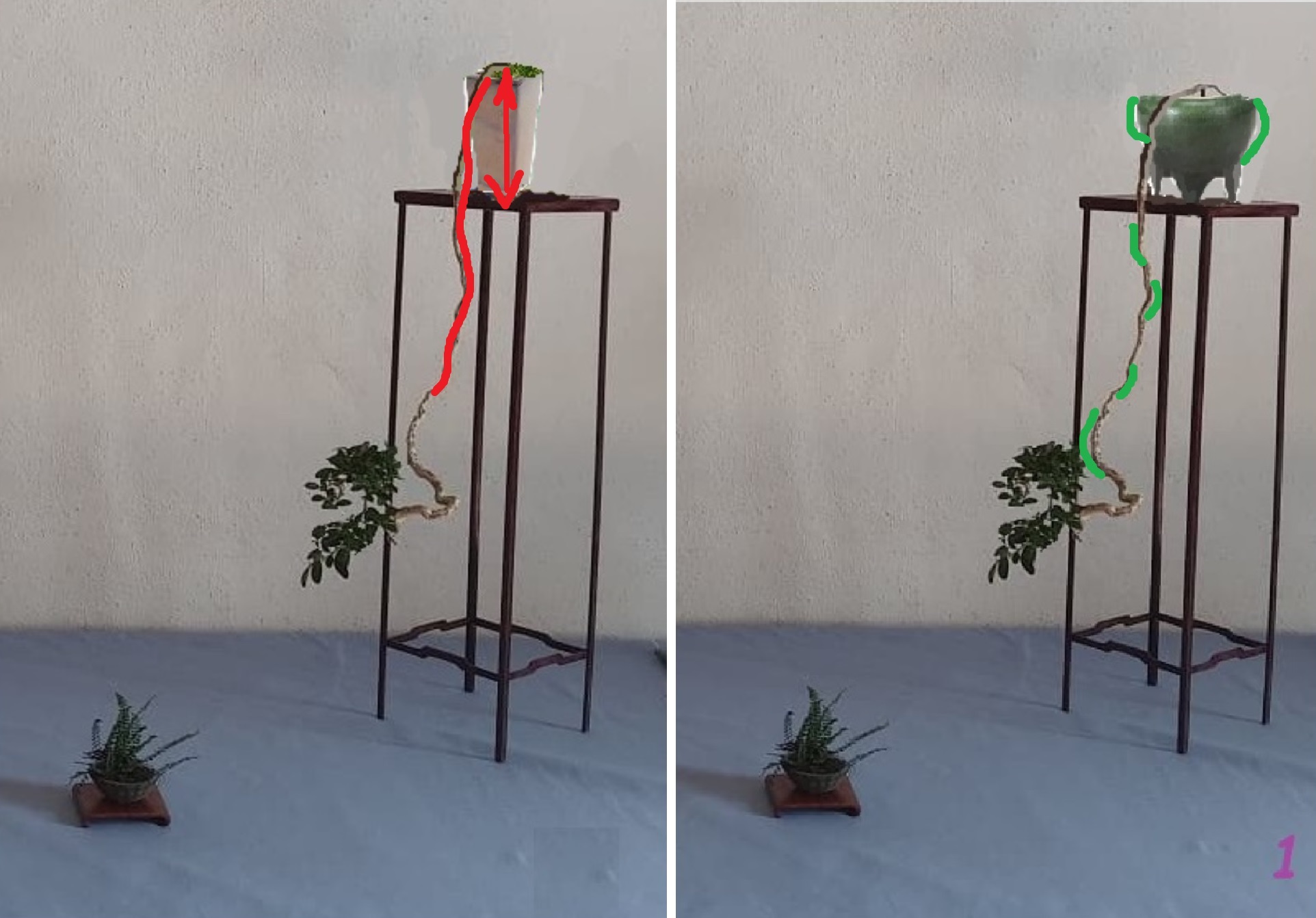 D’un point de vue esthétique, je trouve qu’avec un pot cascade etroit et profond, on ajoute de l’instabilité visuelle ( = logique) et les lignes droites du pot renforcent le coté tombant de la cascade. Tandis qu’avec un pot semi-cascade avec courbes, on met en valeur les courbes de la cascade et on donne plus de stabilité visuelle (et réelle) donc je préfère -de loin- cette association →