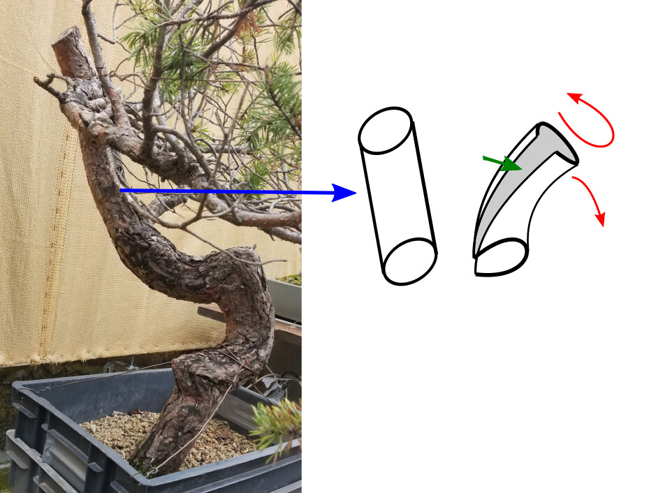 La rotation ressert le diamètre du tronc et peut initier un certain glissement de fibres et une déformation en ellipse que j’exploite pour la courbure vers le bas (bon, c’est théorique, je vais peut-être me retrouver très bête devant mon os, en pratique!)