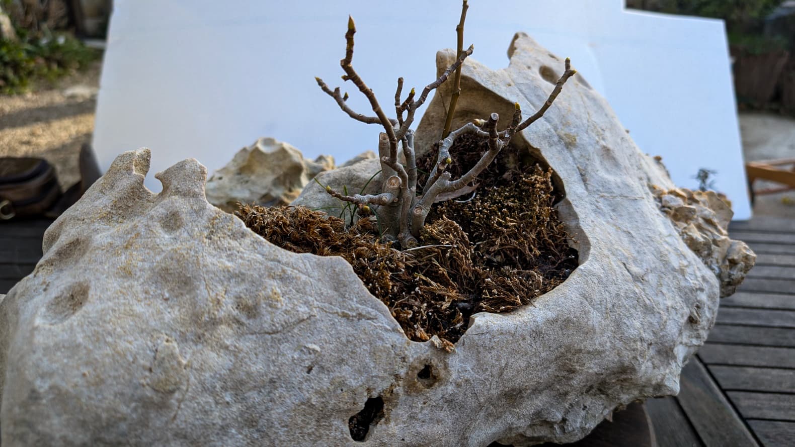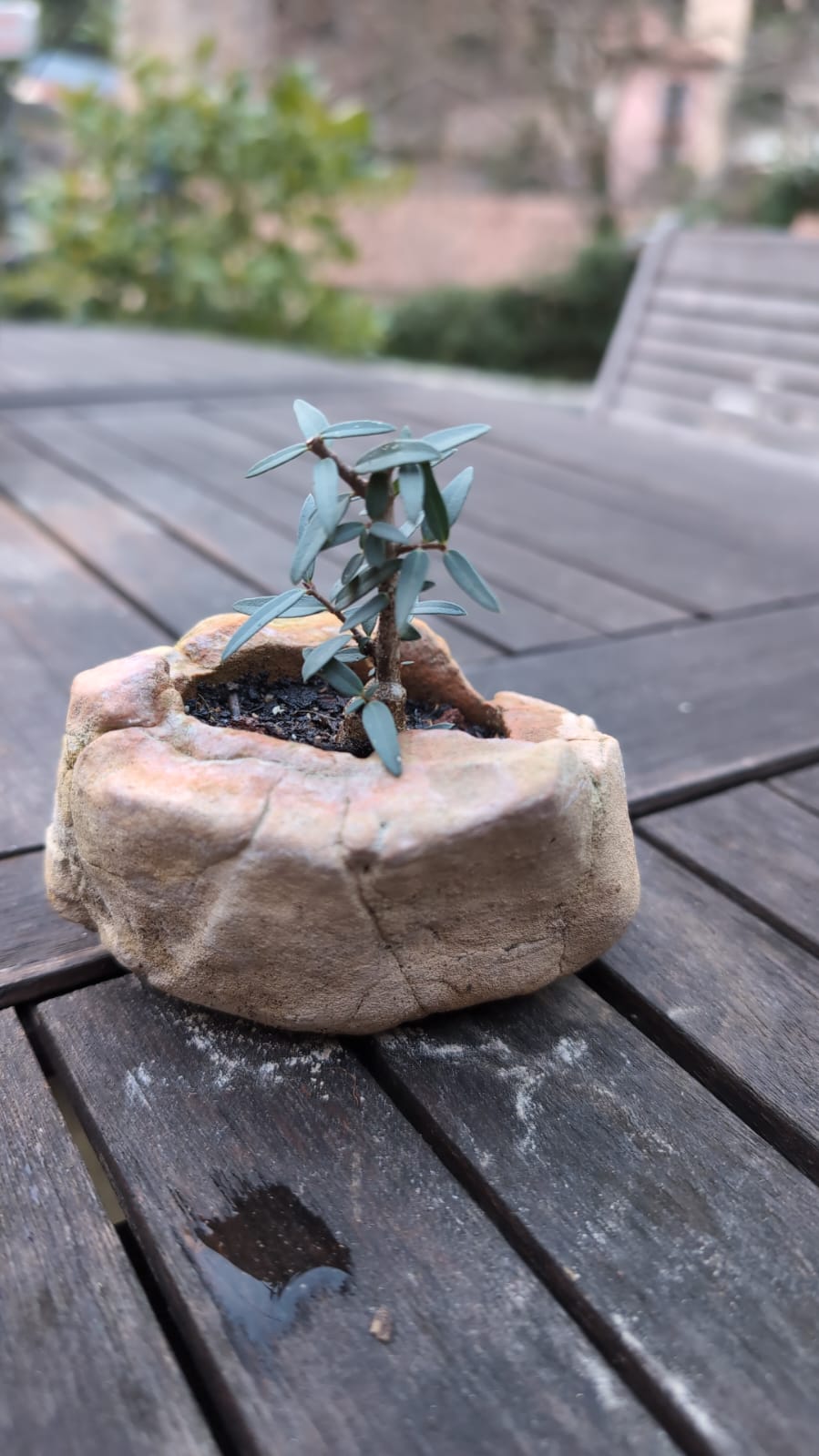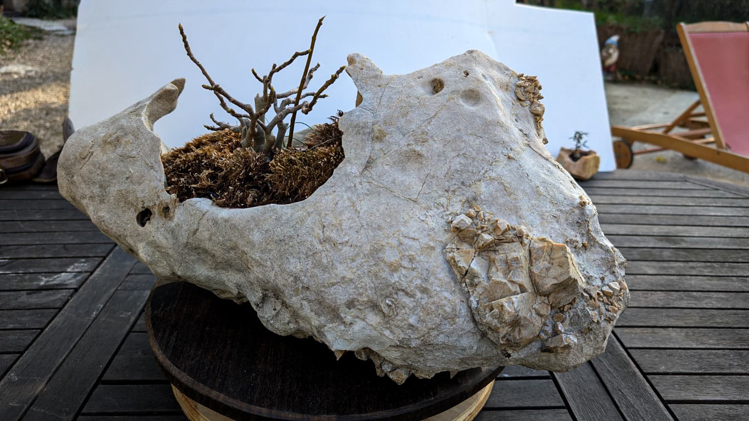 pour le moment posé sur un pot mais par la suite intégrée a un paysage sur une grande lauze .