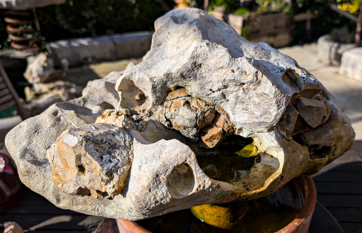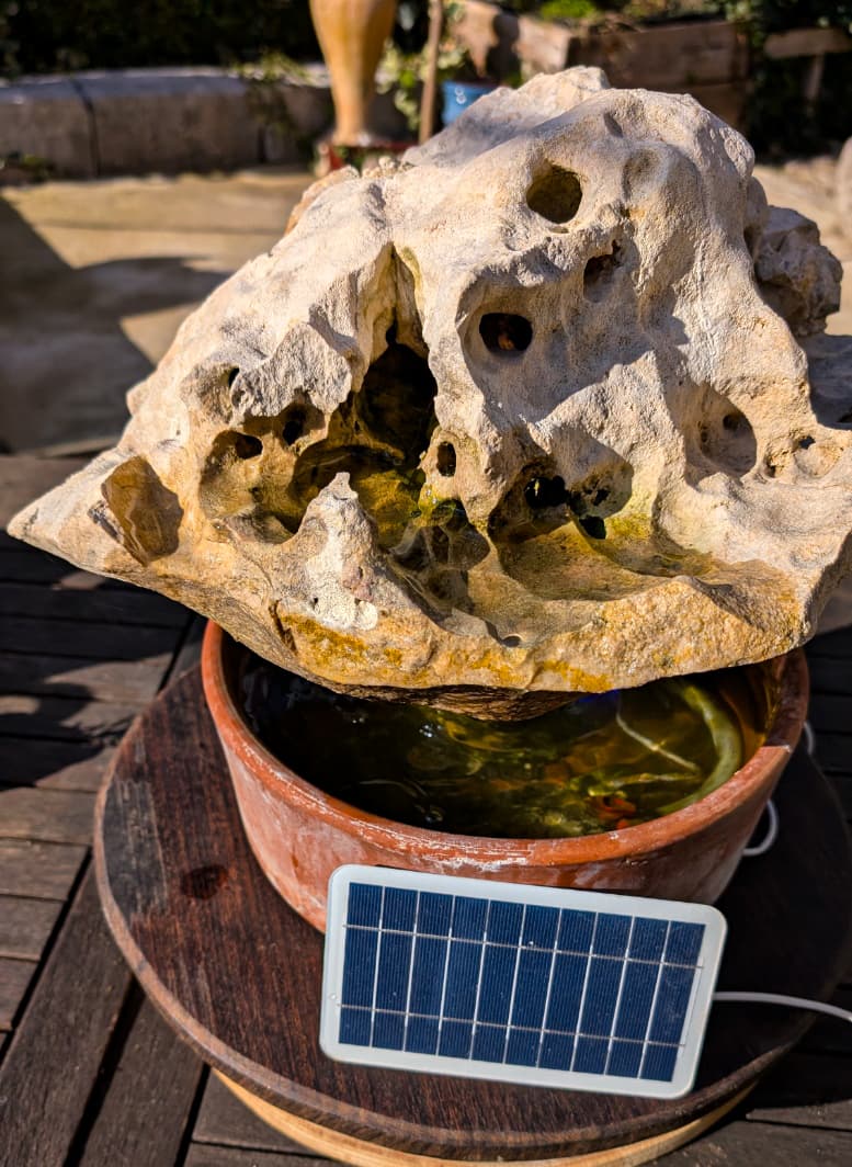 celle la avait des cavité a l’intérieur , j’ai percé la roche par dessous pour y faire passer un tube lui même alimenté par une petite pompe de gamelle a chat .(30 balle)