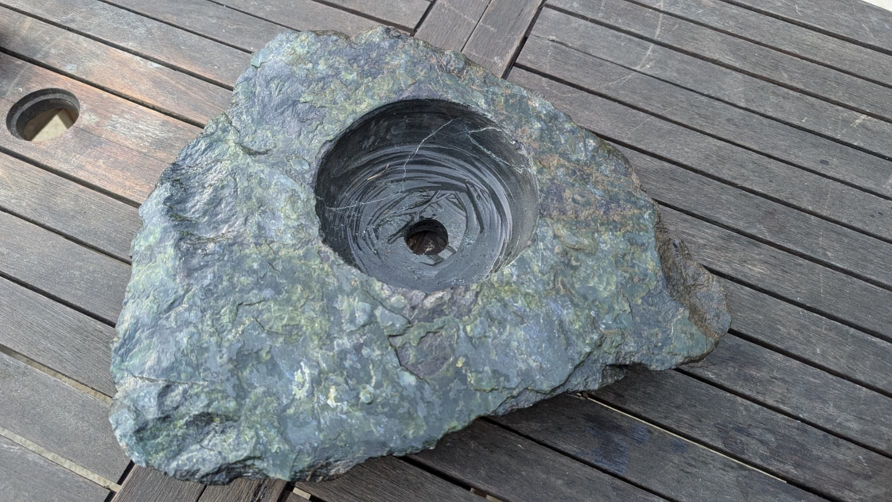 bonsoir a tous , juste pour partager , aujourd’hui c’est cailloux , j’ai travaillé un bloc d’olivine serpentine de provenance corse afin d’en faire un “pot” pour un petit olivier .le trous d ‘environ 140/150 de diamètre a été réalisé a la meuleuse .une petite heure et beaucoup de poussière plus tard je perçais le fond avec un foret a béton de 30 de chez wish , avec de l’eau et de la patience ca le fais .le dessous a été découpé et j’ai décaisser trois pieds .