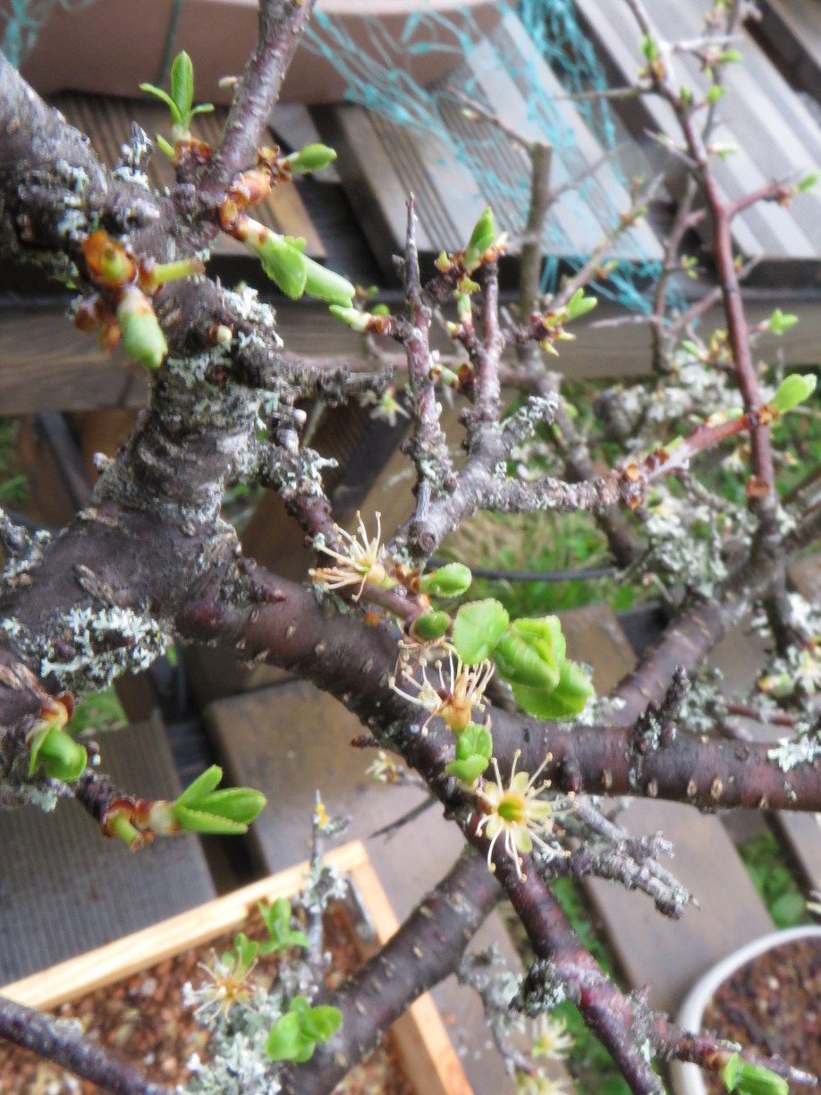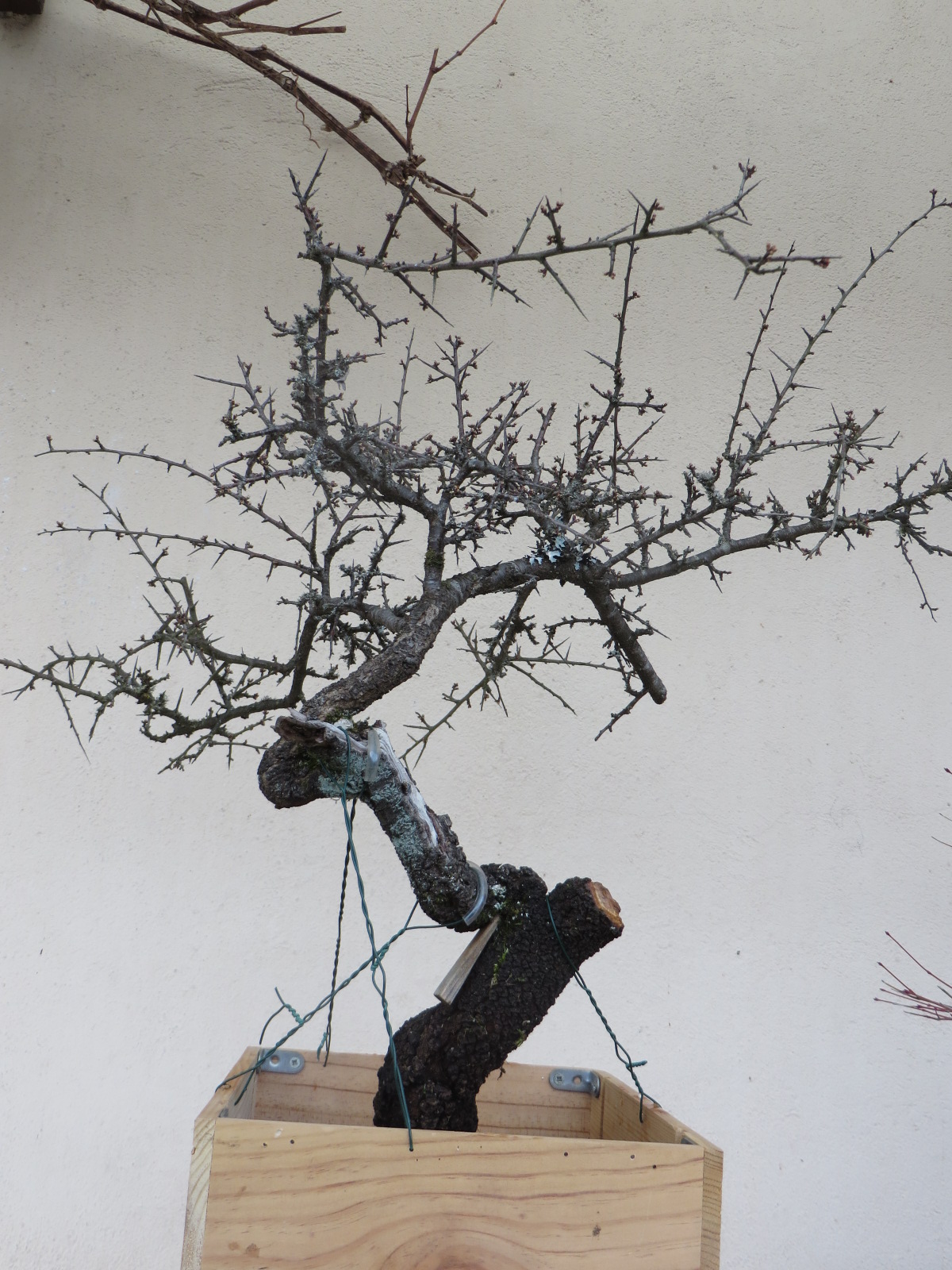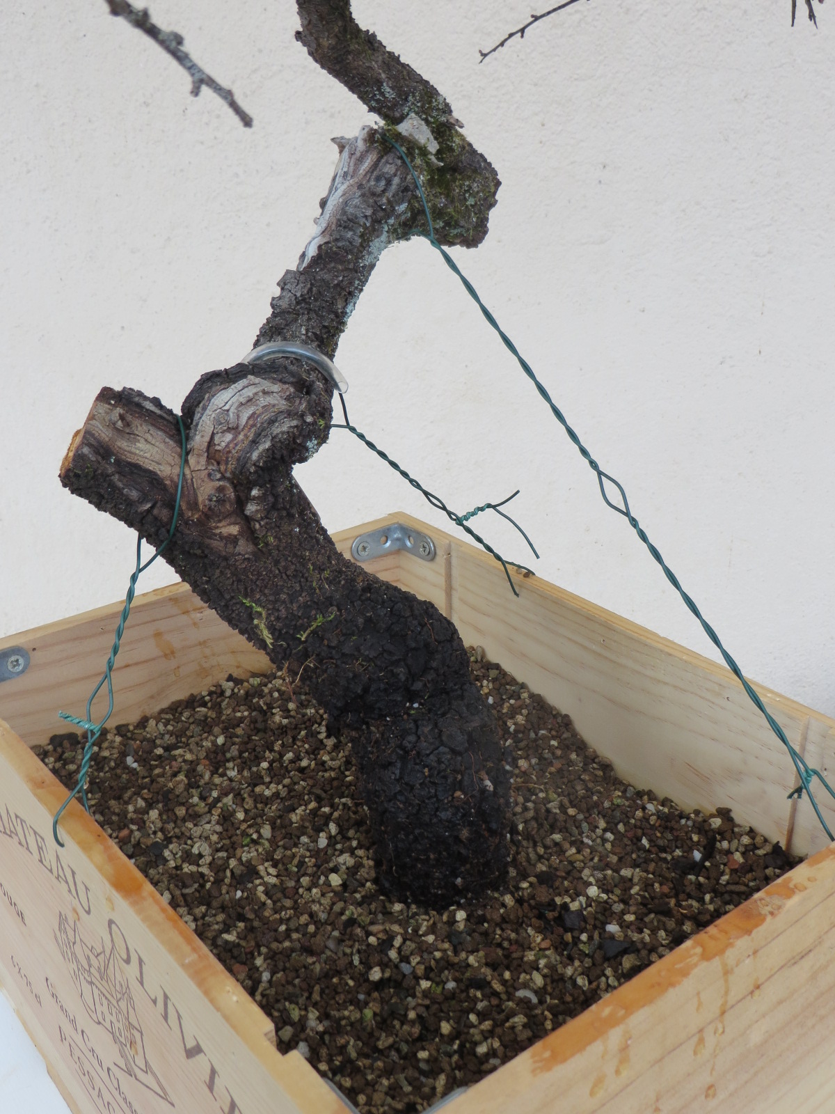 Ce matin j'ai vissé la base du tronc dans la caisse (une première pour moi) et j'ai haubané. Ensuite j'ai taillé dans les branches bien chargées de boutons à fleur.