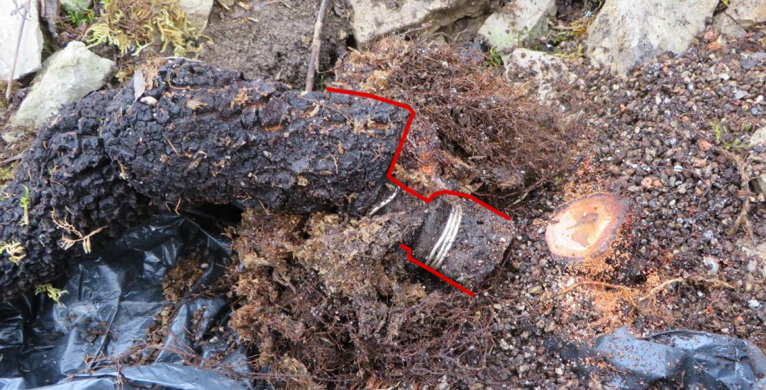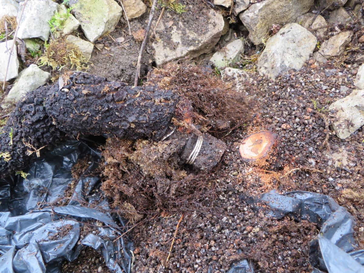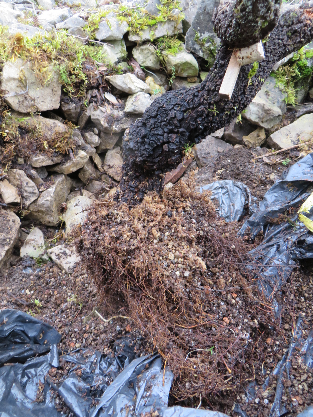 C'est en reprenant le substrat pour remettre l'arbre en jauge jusqu'au lendemain que j'ai constaté la boulette. Un départ de racine avait cassé ce qui correspond à environ un quart de la masse globale des racines.