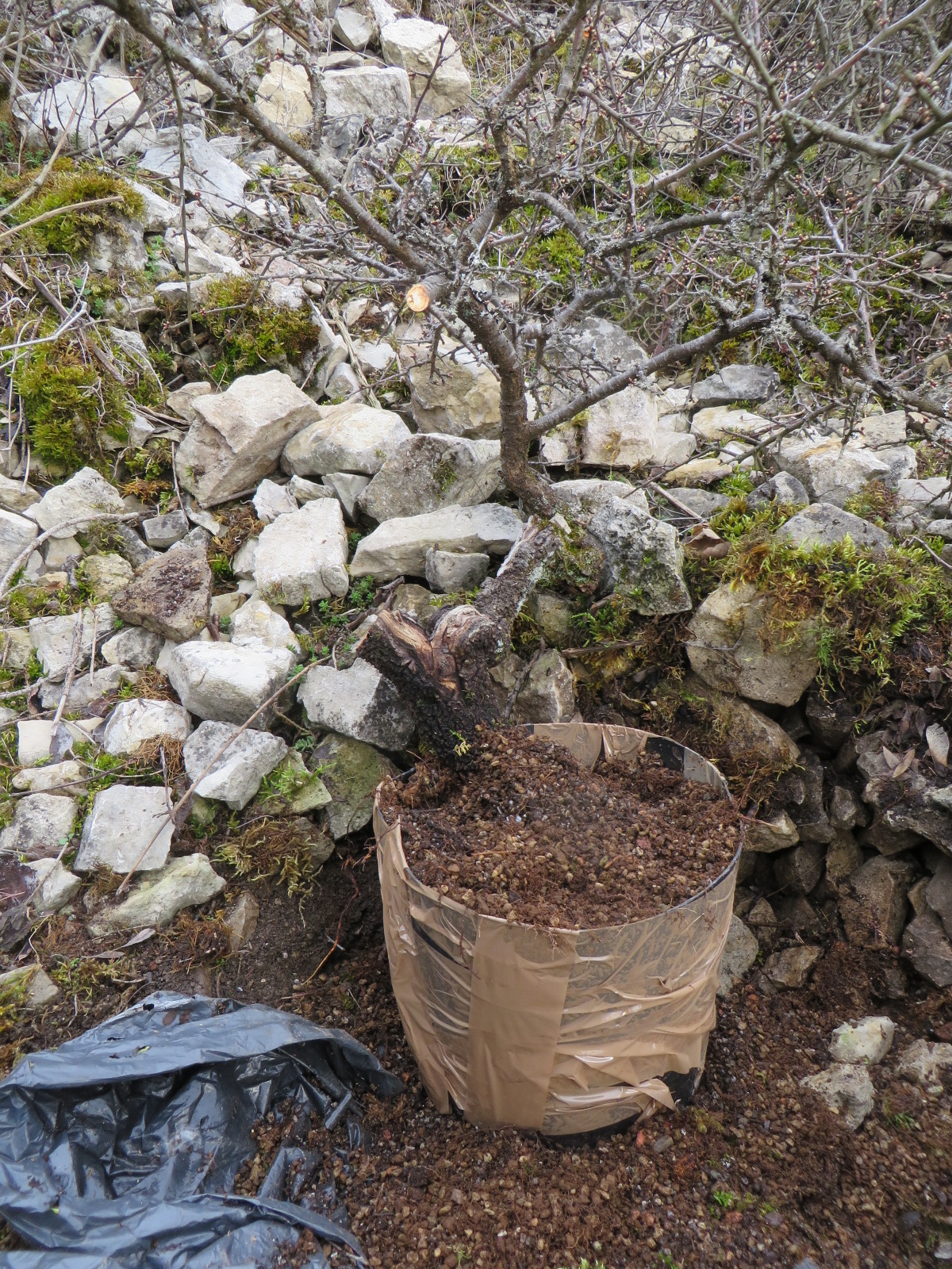 Reconstitution du pot avec du scotch brun. Je n'avais prévu aucun autre conteneur pour transporter l'arbre sevré.