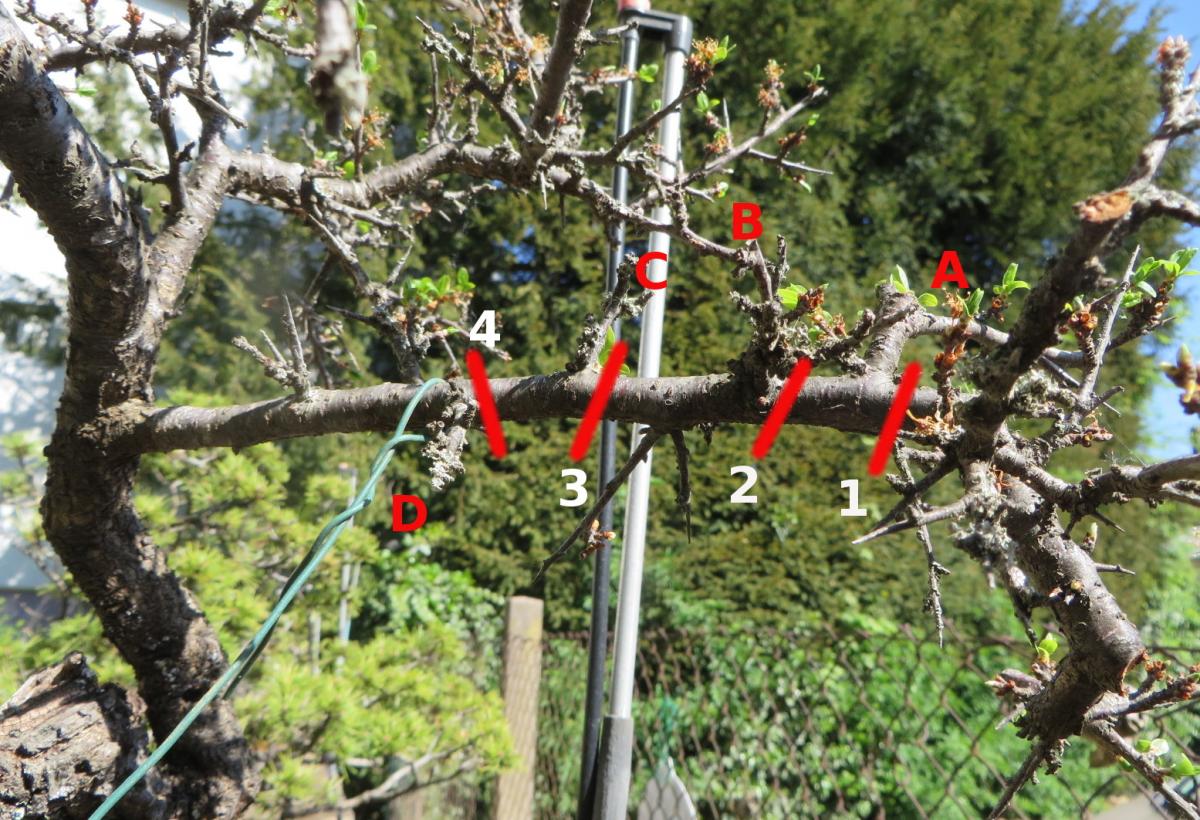 C'est le principe. En pratique il y a bien sur une variabilité et en coupant 1 on peut très bien avoir une promotion de la branche B. Mais globalement le prunelier -comme d'autres essences - répond assez bien à ce schéma. Il le fait simplement avec un peu plus de sauvagerie et peut réserver la surprise de nouveaux départs ex nihilo en amont
