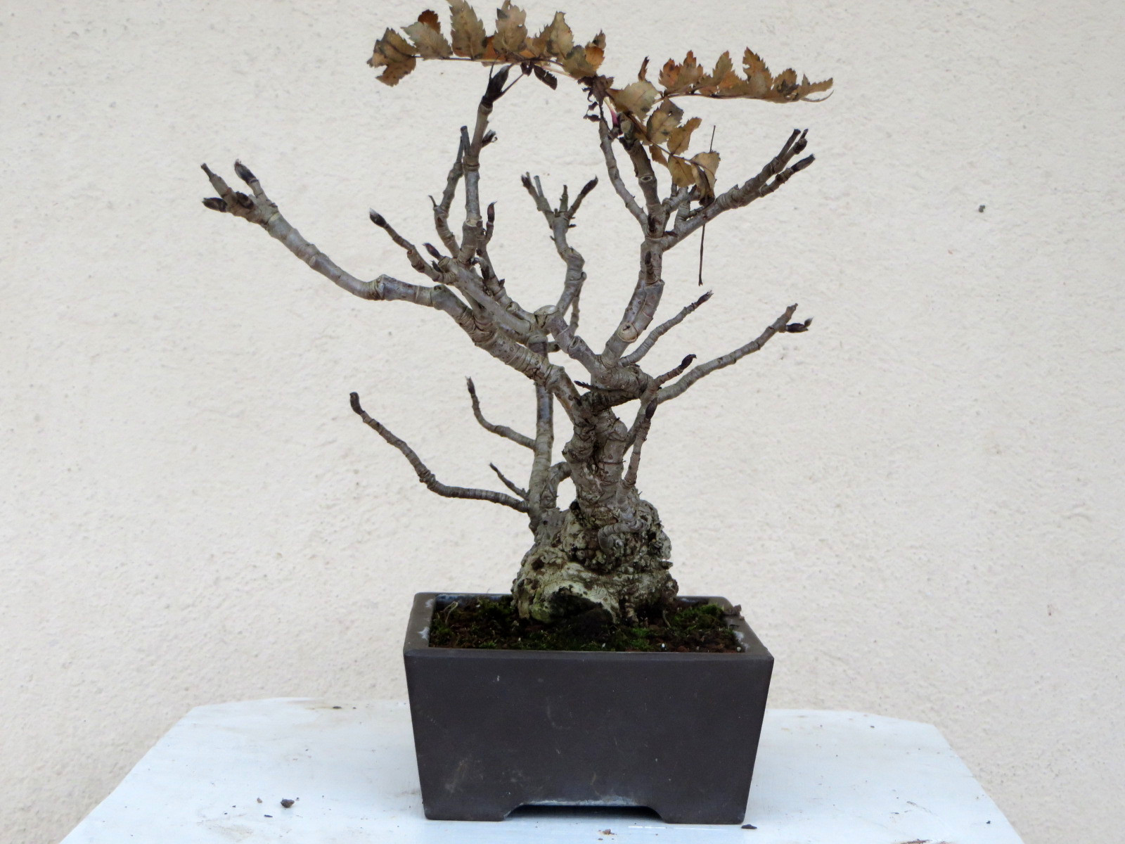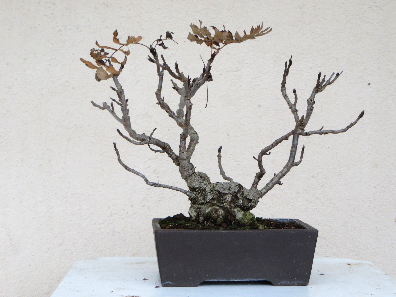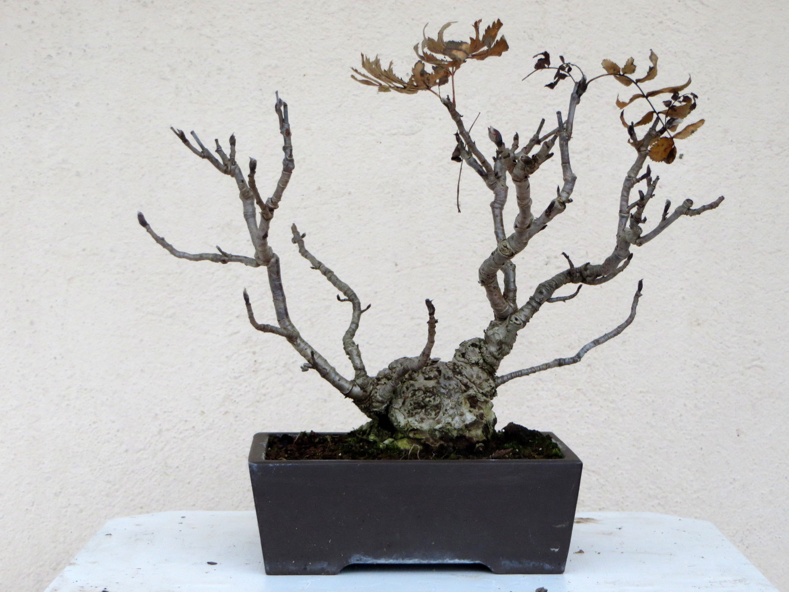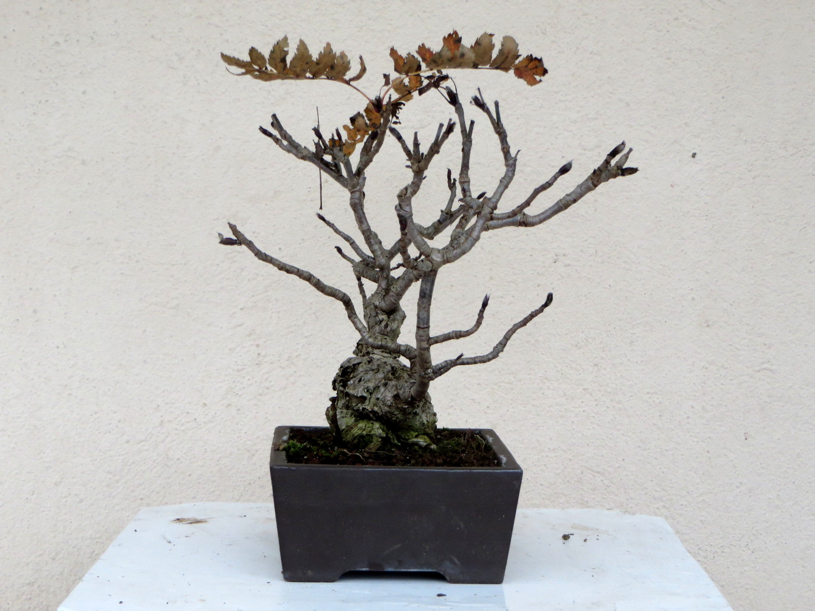 Pour l’instant je m’évertue à le faire ramifier en stimulant des bourgeons arrière dormant. Ce faisant, je compte sur une réduction de la longueur des pétioles et de ce fait de la taille des folioles. C’est possible, je l’ai observé souvent sur les sorbiers broutés.